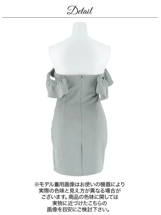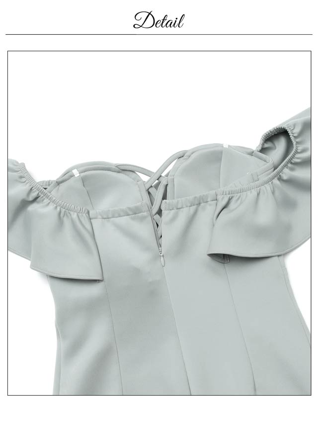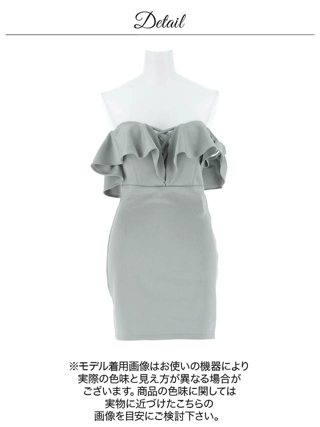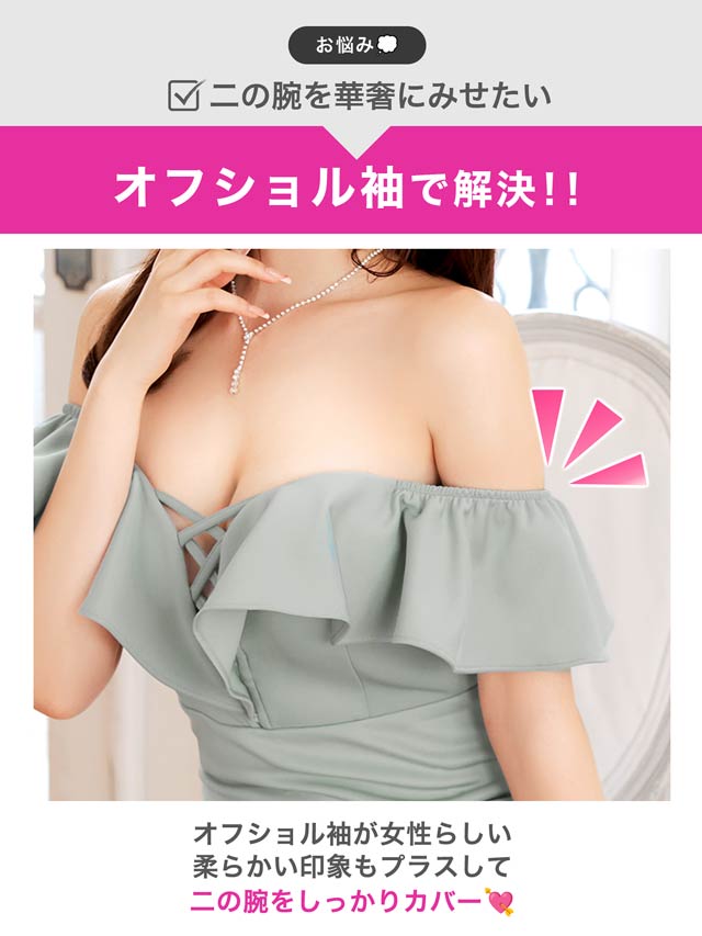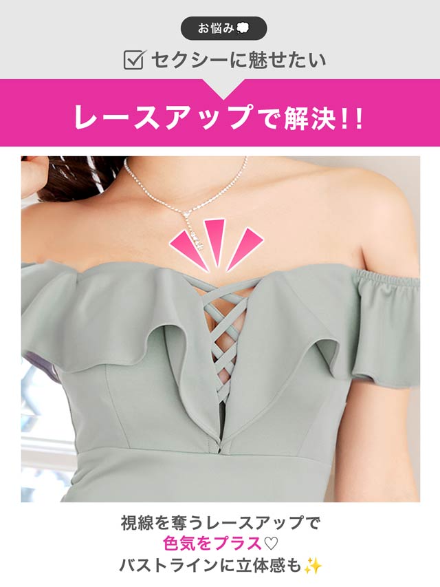 ボリューム感のあるフリルデザインが大人セクシーなキャバドレス。胸元のレースアップがバストラインを美しく演出し、視線を釘付けに◎ オフショル仕様で気になる二の腕をさりげなくカバーしつつ、華奢見え効果もばっちりな1着です。
