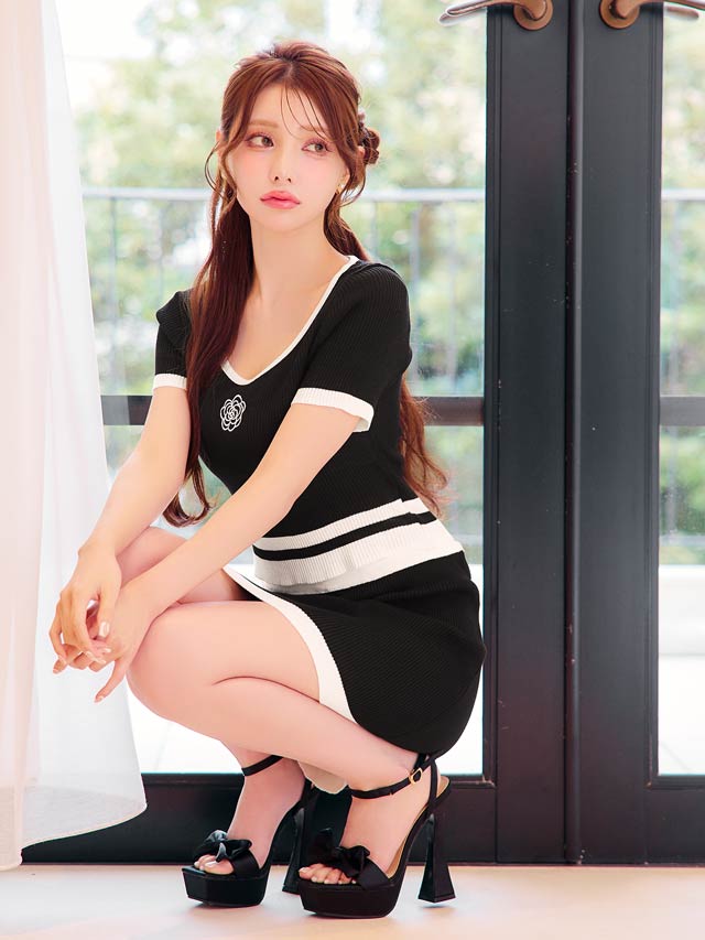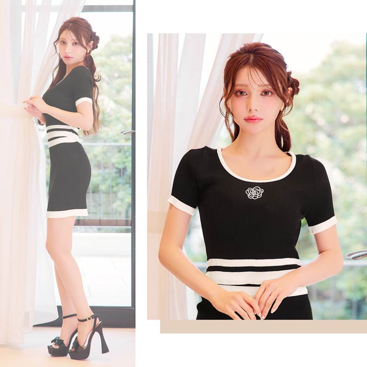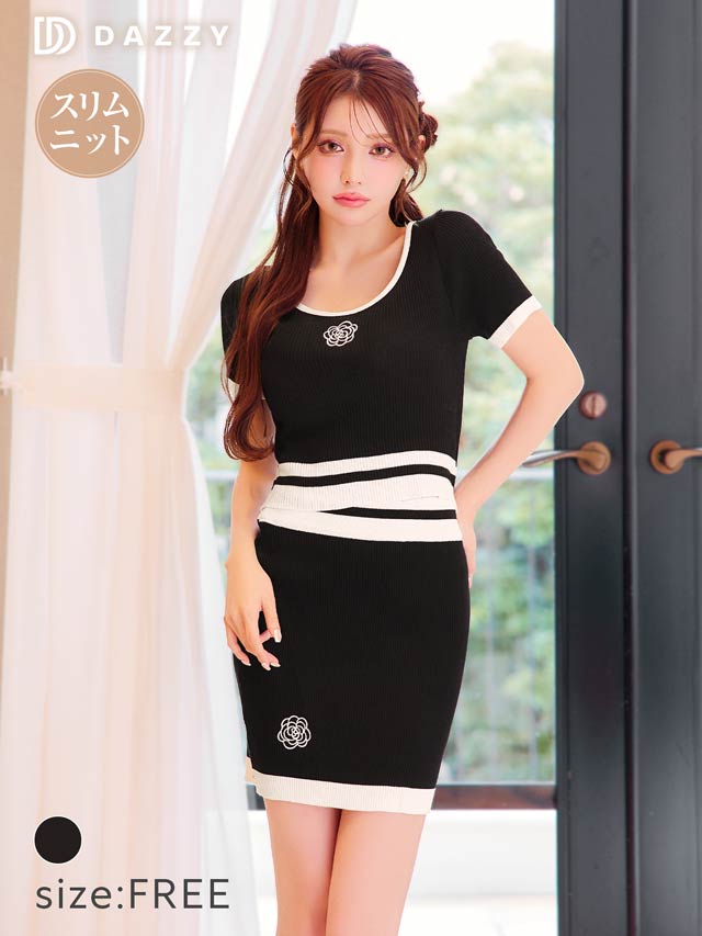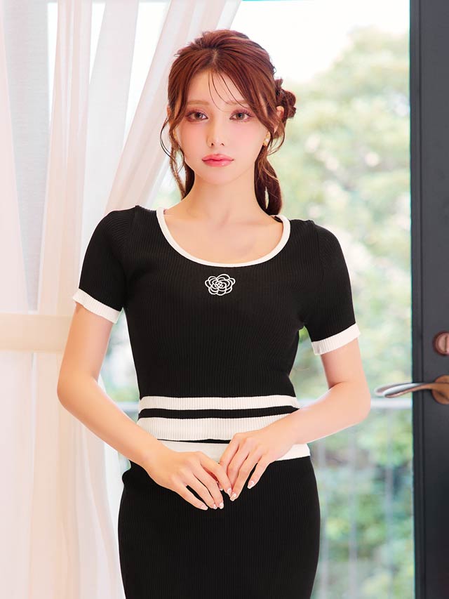 可愛らしいお花の刺繍がアクセントになったニットトップス&スカートセットアップ。フィット感のあるシルエットとメリハリを効かせる配色ラインで女性らしい美スタイルを演出◎お仕事シーンから私服コーデまで幅広く着回せる優秀アイテムです!