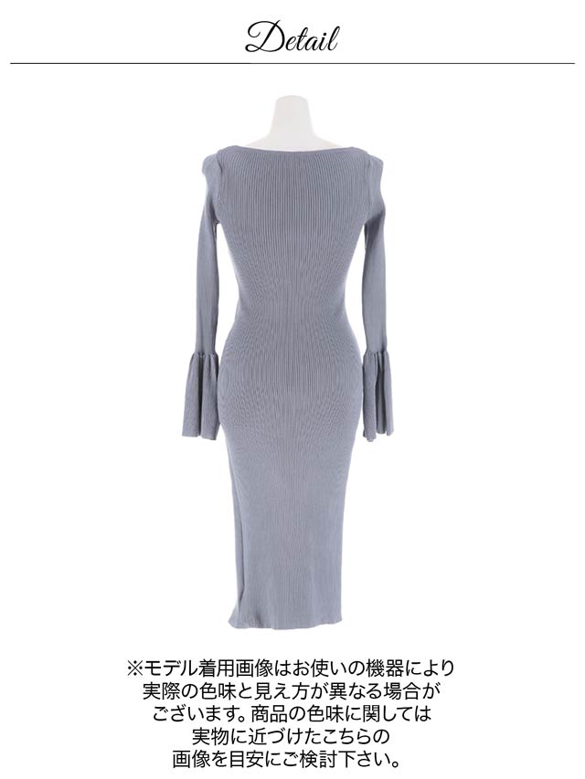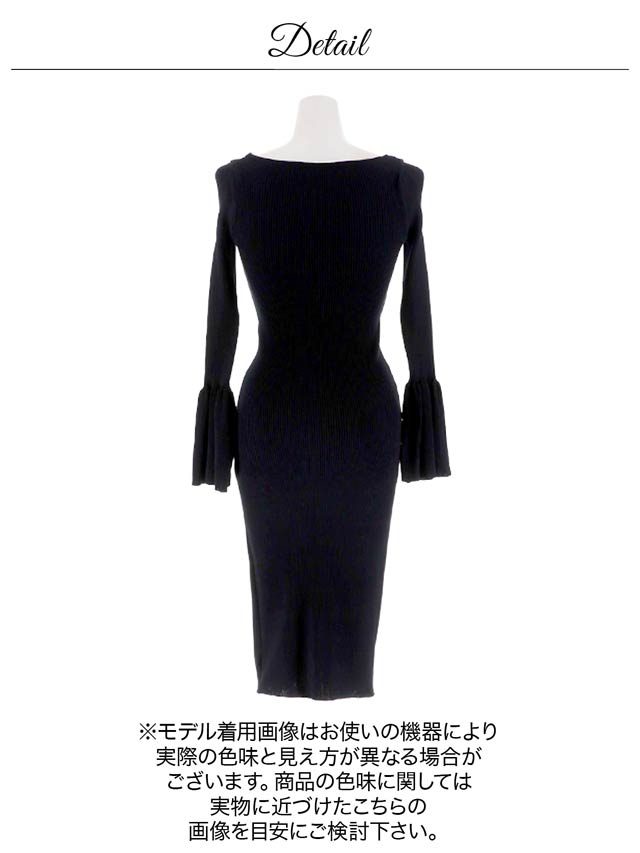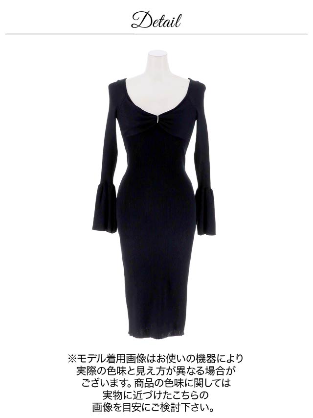バスト中央のシルバービジューで束ねたリボンモチーフが女性らしいニットワンピース。デコルテを綺麗に見せてくれるラウンドネックが色気を引き立たせます◎ 袖口のベルスリーブが華やかな印象を与えてくれる1着です。