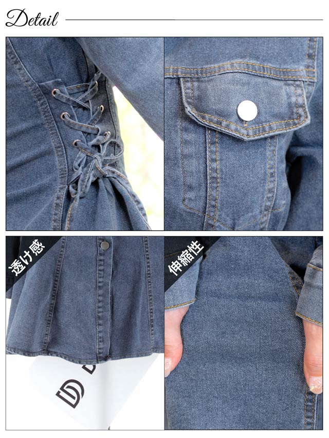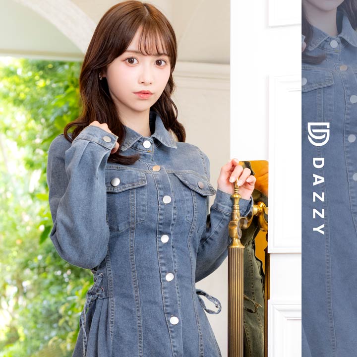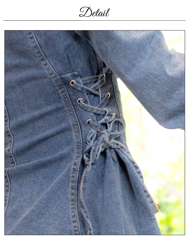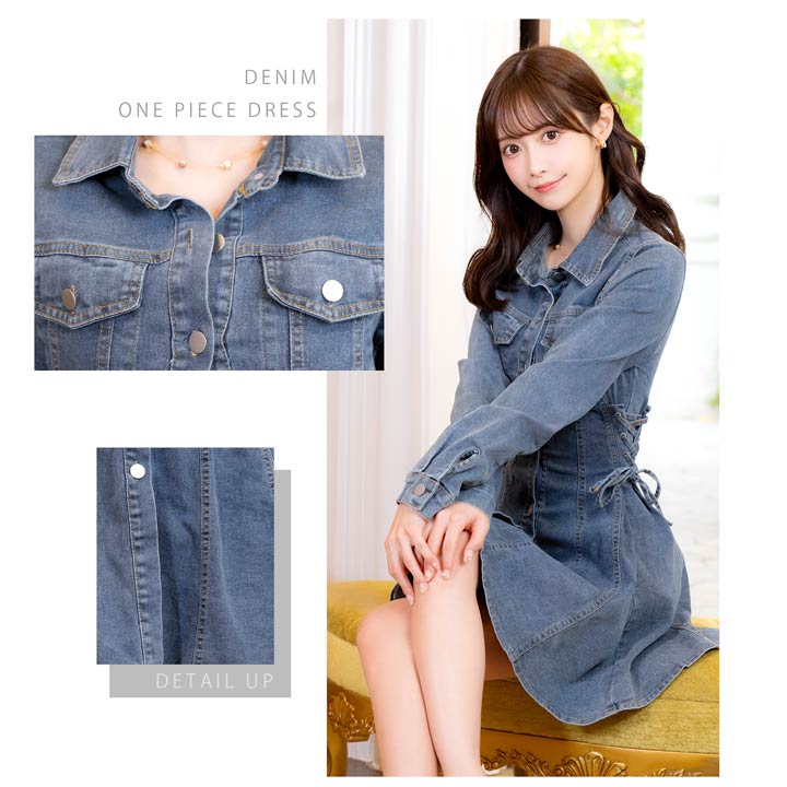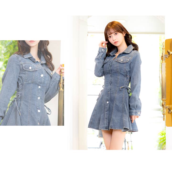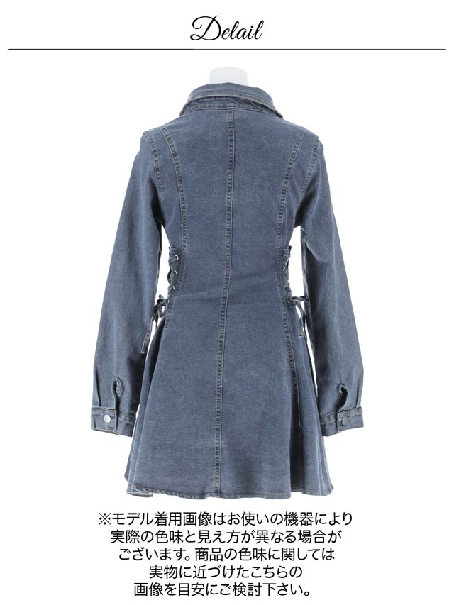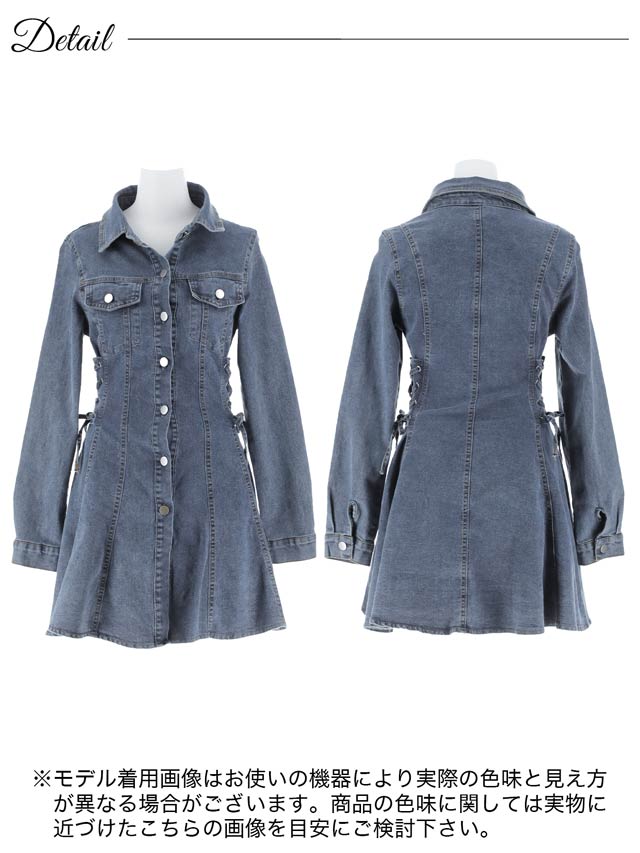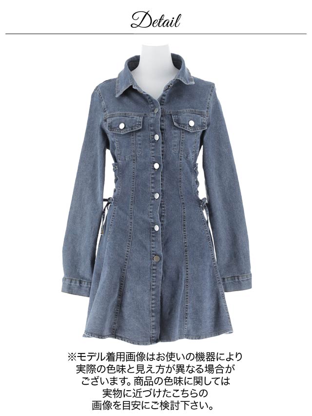 シルエットを細見せしてくれる人気のレースアップデザインをウエストサイドにあしらったデニムワンピース。Aラインスカートでカジュアルかつキュートな着こなしが出来るので周りと差が付くこなれ感もばっちりなアイテムです♪