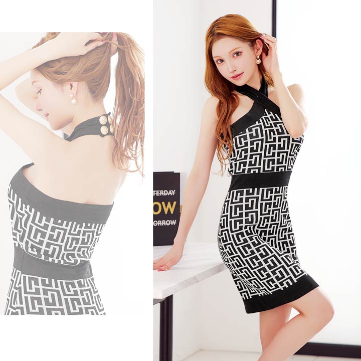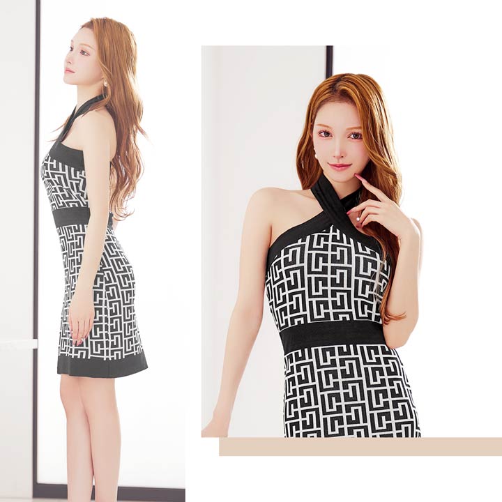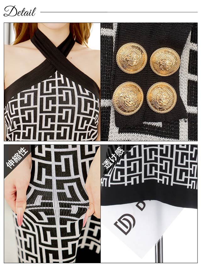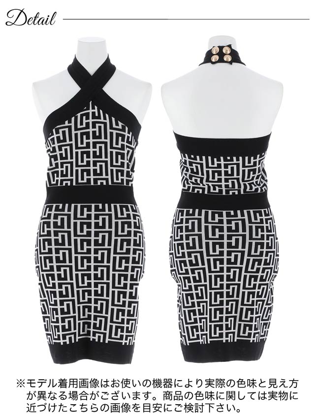 バイカラー配色のジオメトリック柄が印象的なニットワンピース。後ろ姿からもこだわり溢れるボタンビジュー付きのホルターネックは女性らしいこなれ感を演出します◎ お仕事はもちろんプライベートでの着回しも出来ちゃうアイテムです。