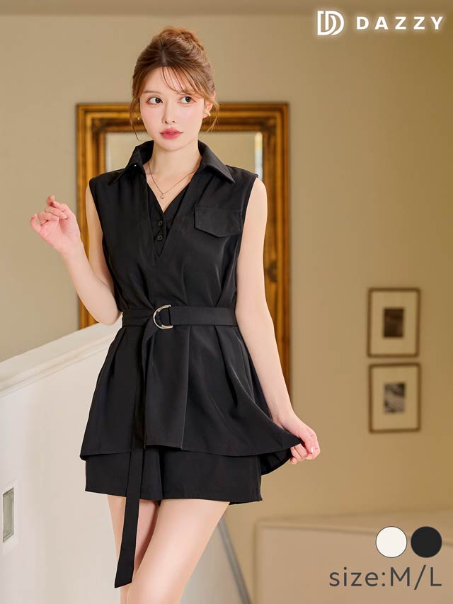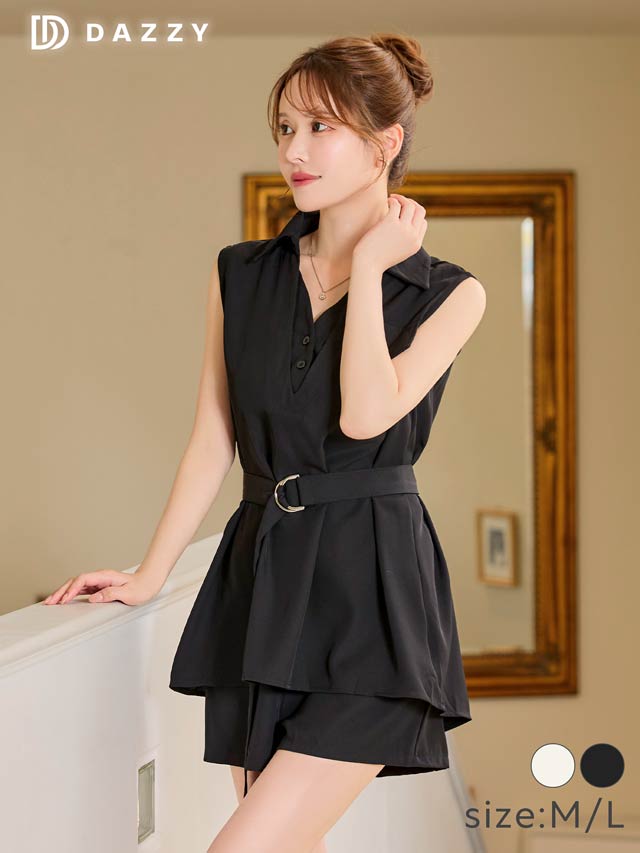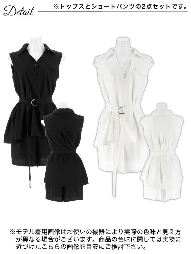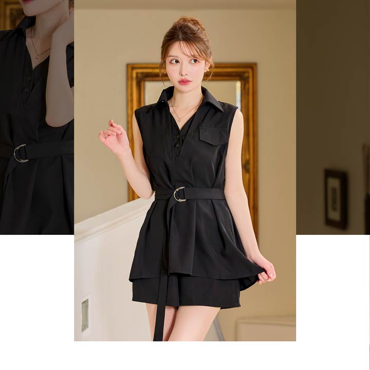 Vネック部分のレイヤードデザインがオシャレ感をアップしてくれるセットアップ。シャツワンピース風の着こなしがカジュアル過ぎない綺麗めコーデにもおすすめな1着! ベルト付きでウエストをしっかりマークできるのもポイントです。