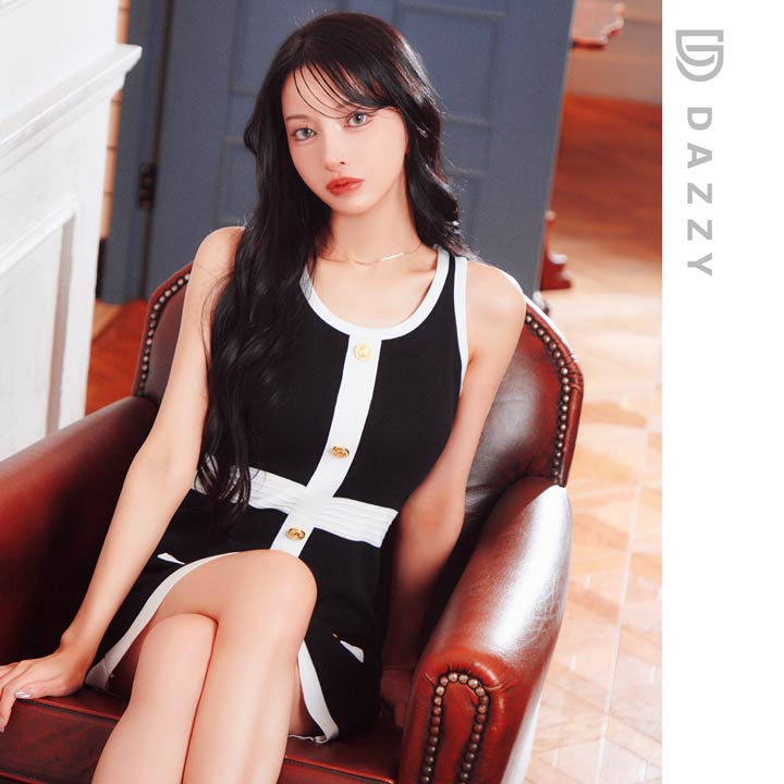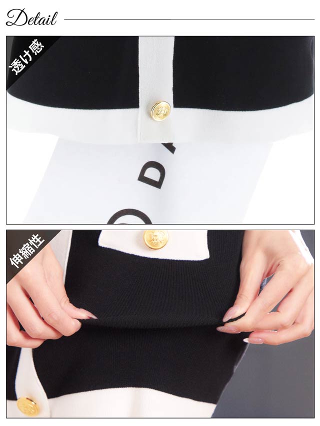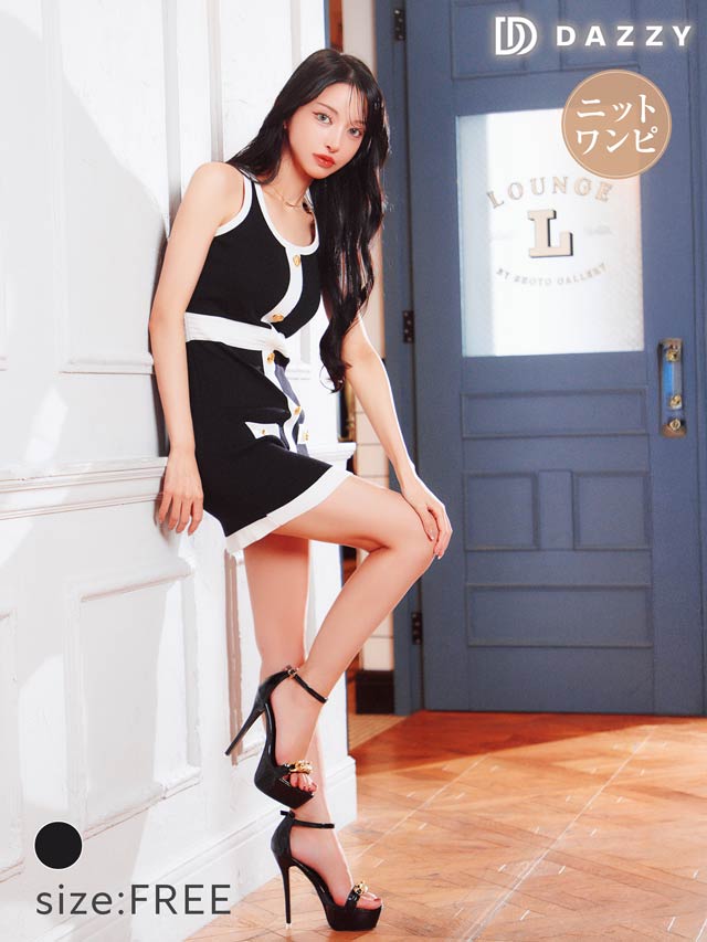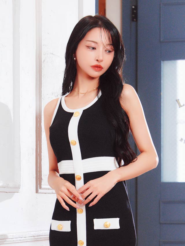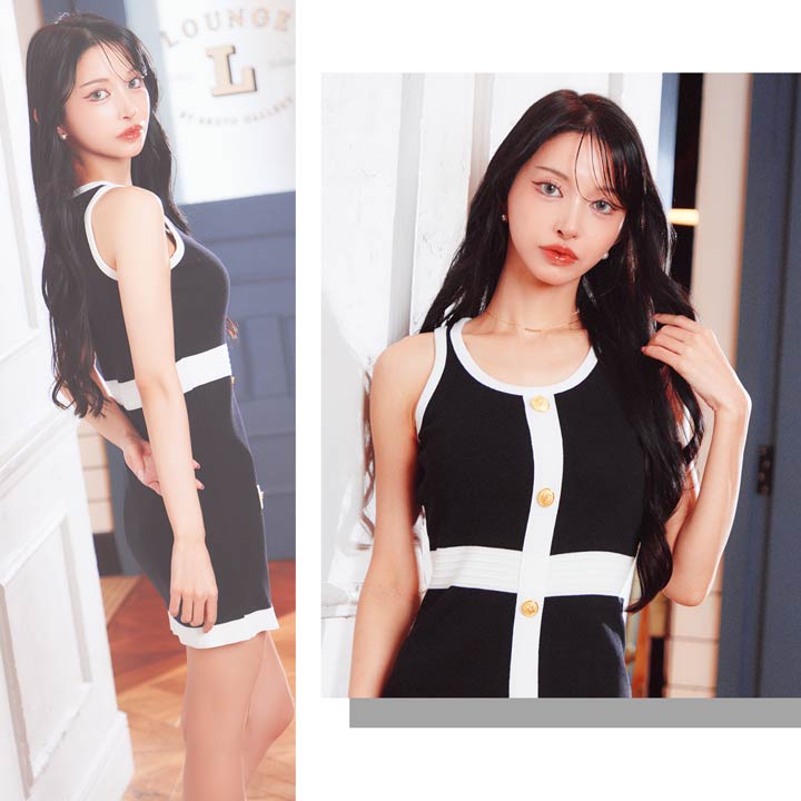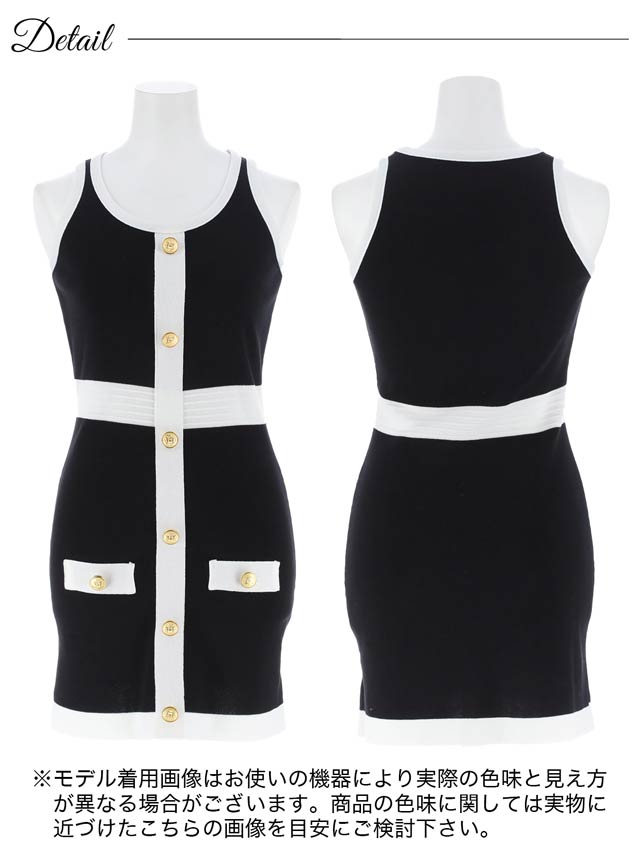バイカラー配色のフロントラインがこなれ感漂うニットワンピース。スカート裾まであしらわれた煌びやかなゴールドボタンが高見え効果をプラスします◎ ボディラインにフィットするニット素材で女性らしい曲線美を演出してくれる1着です◎