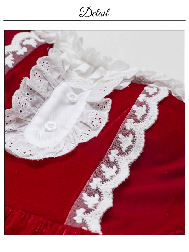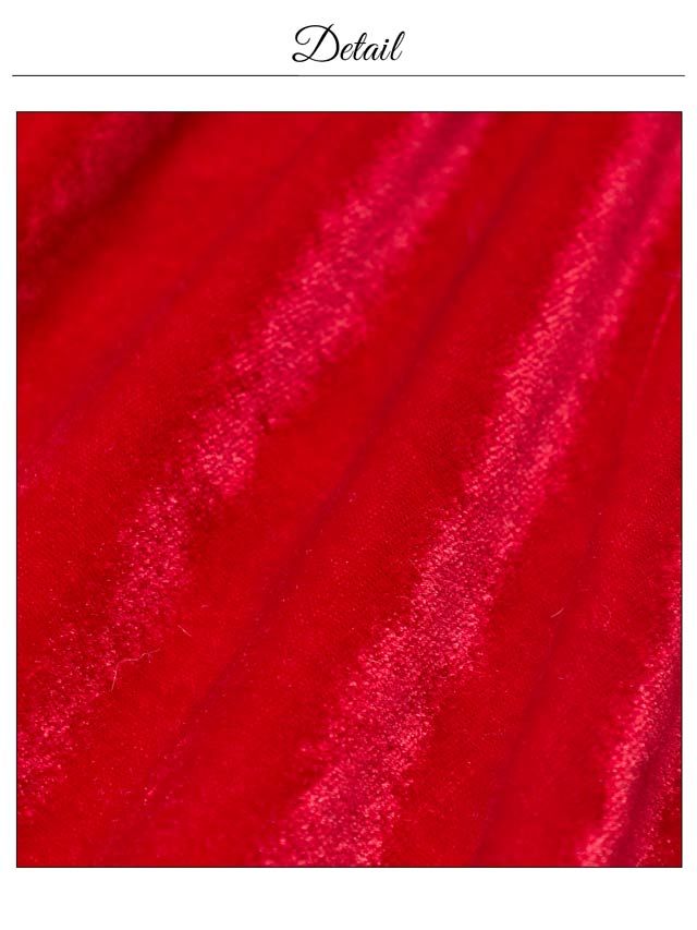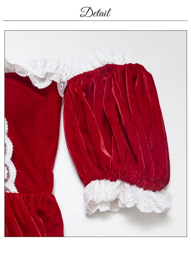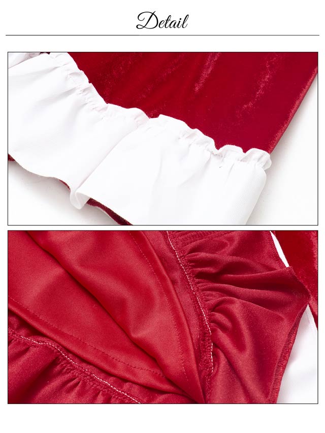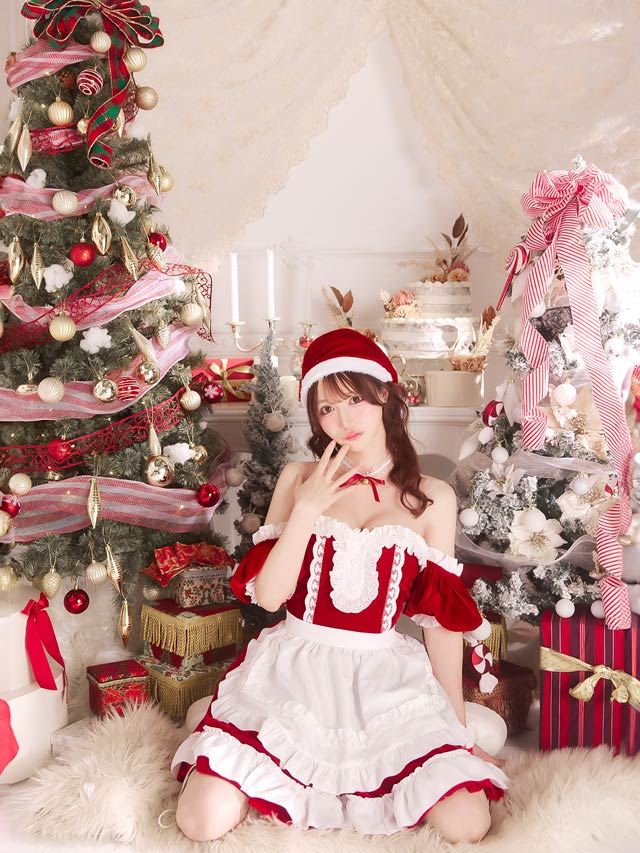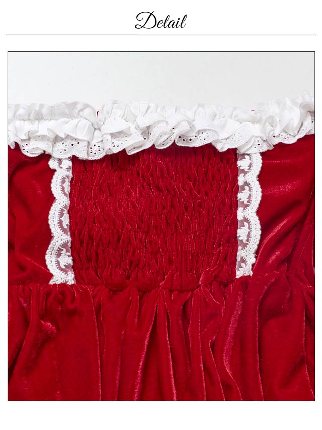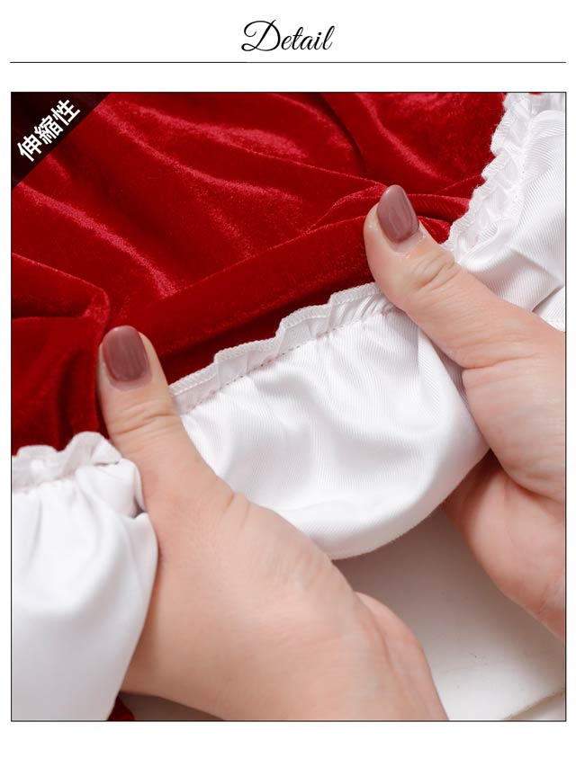 オフショルダー仕様でデコルテを美しく魅せつつ、胸元と裾にはボリュームたっぷりのフリル&レースをあしらったカワイイ・フェミニンなメイド風サンタコスチューム。ふわっと広がるスカートはシルエットが綺麗で、動くたびに華やかさを演出してくれます。首元のリボンチョーカーとサンタ帽がセットになっているので、コーディネートも簡単です◎