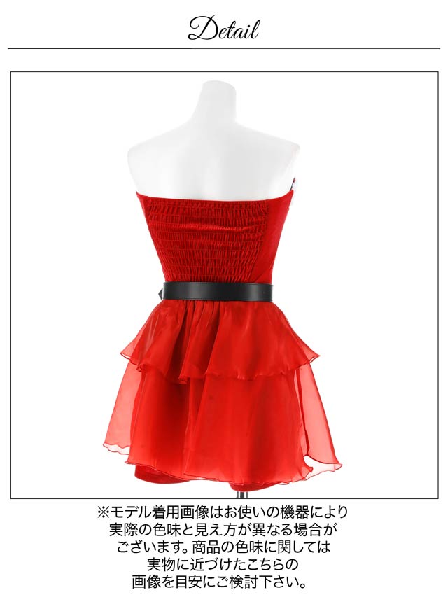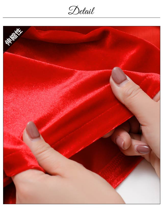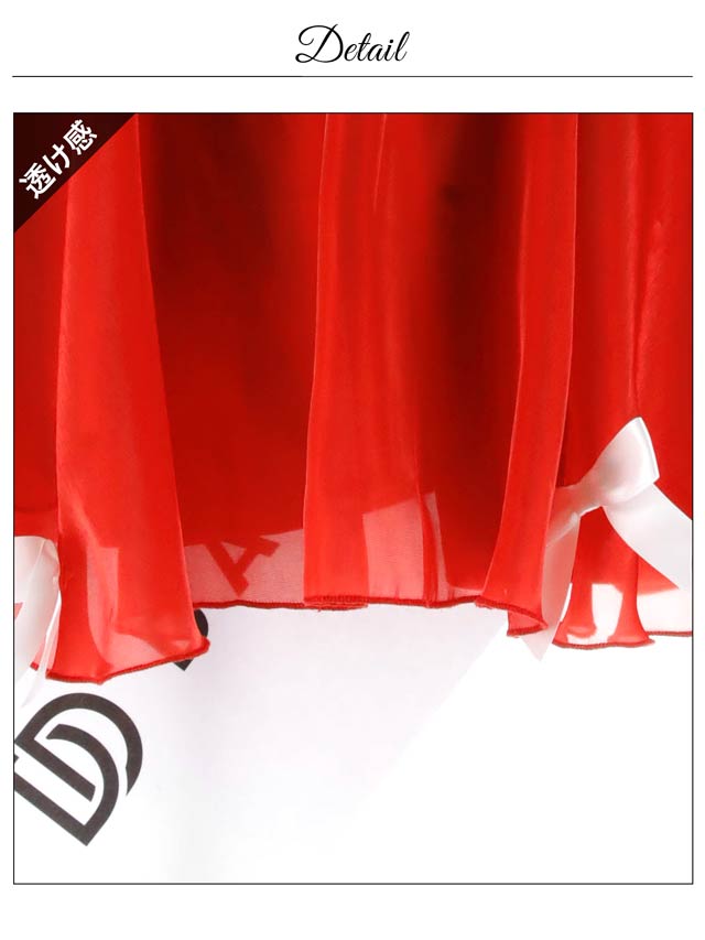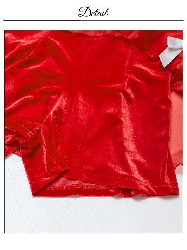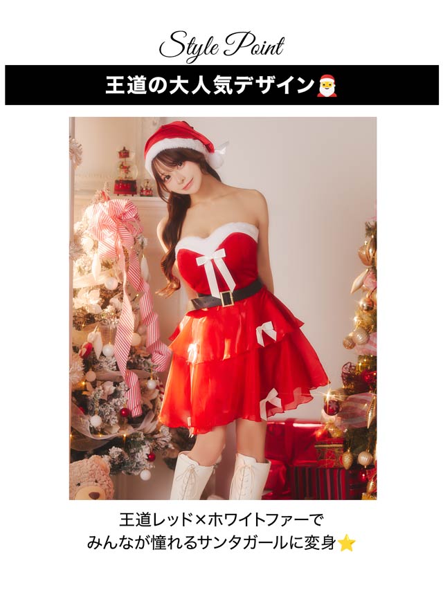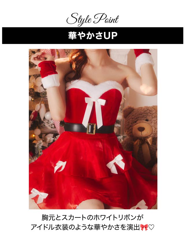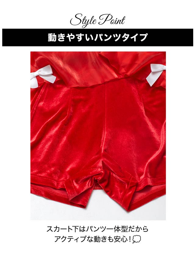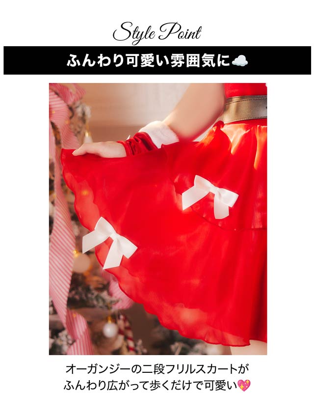 リボン&オーガンジーフリルがまるでアイドル衣装のような可愛らしいサンタコスチューム。たっぷりあしらわれたホワイトリボンにふんわり広がるオーガンジーの二段スカートが歩くだけで華やかさ抜群♪ スカート下はパンツ一体型で、ダンスやアクティブな動きも安心な1着です。
