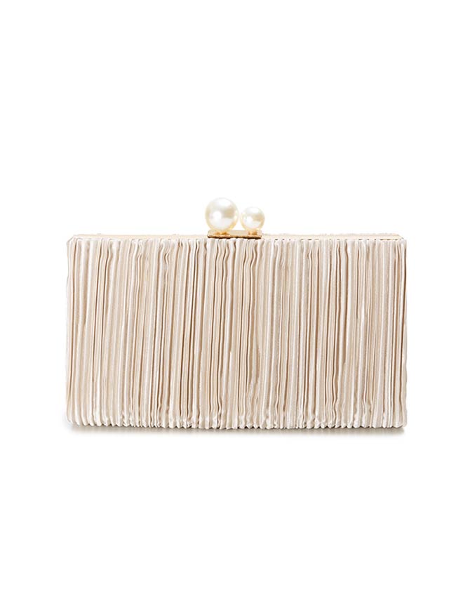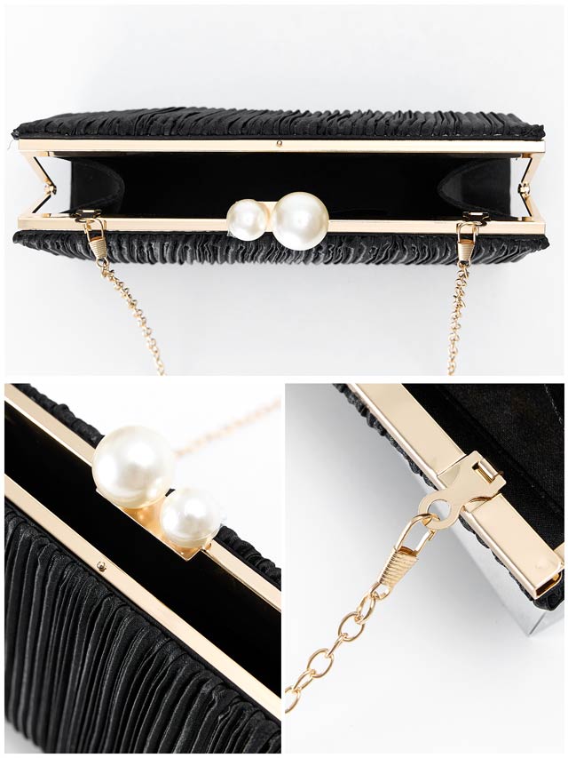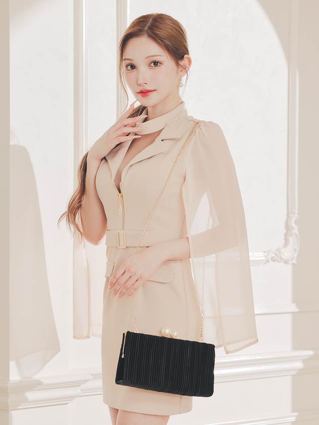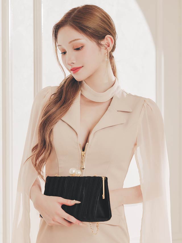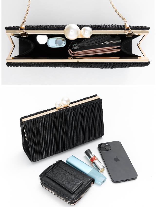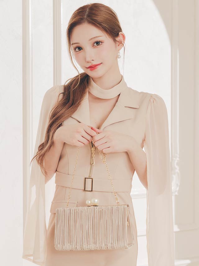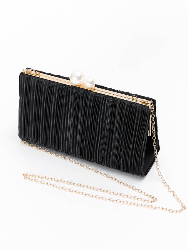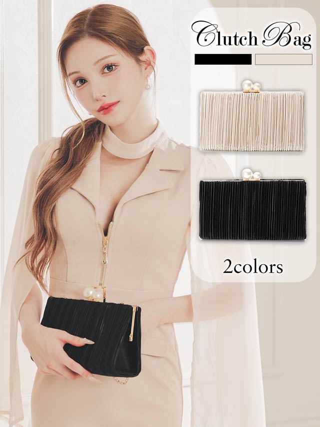 細かいプリーツデザインに開き口の大粒パールがゴージャスなクラッチバッグ。女性らしいチェーンショルダー付きで肩掛けとしてもお使い頂ける便利な2way仕様です♪ キャバドレスはもちろんパーティードレスコーデにも合わせられるアイテムです。