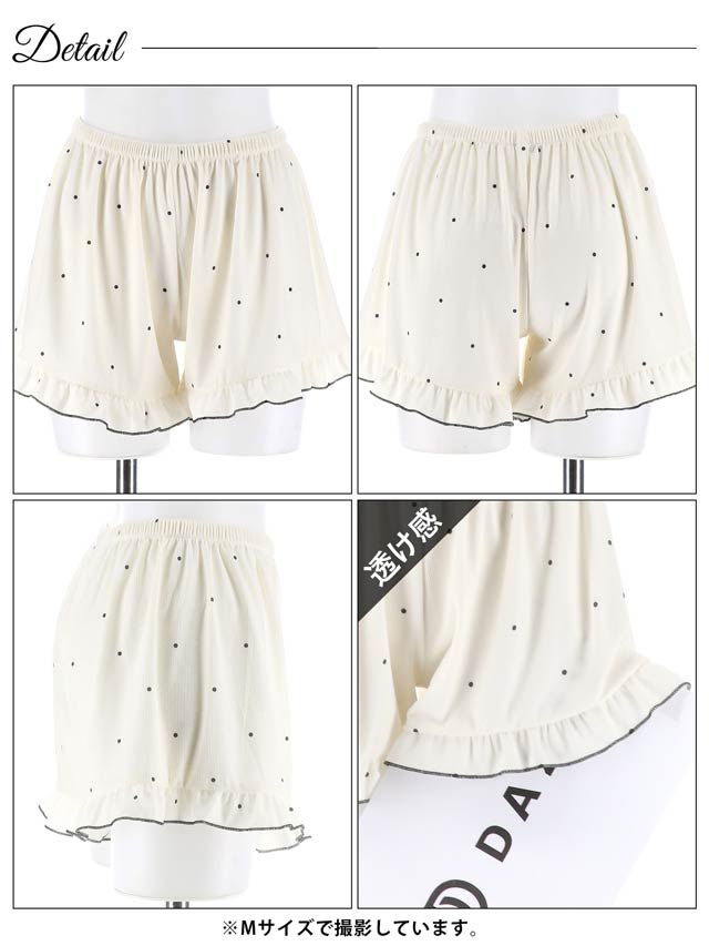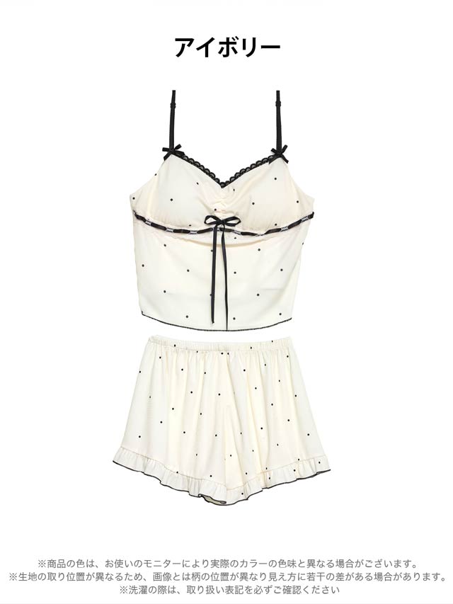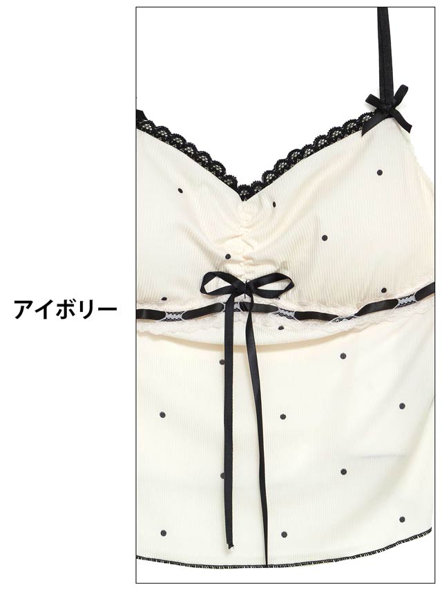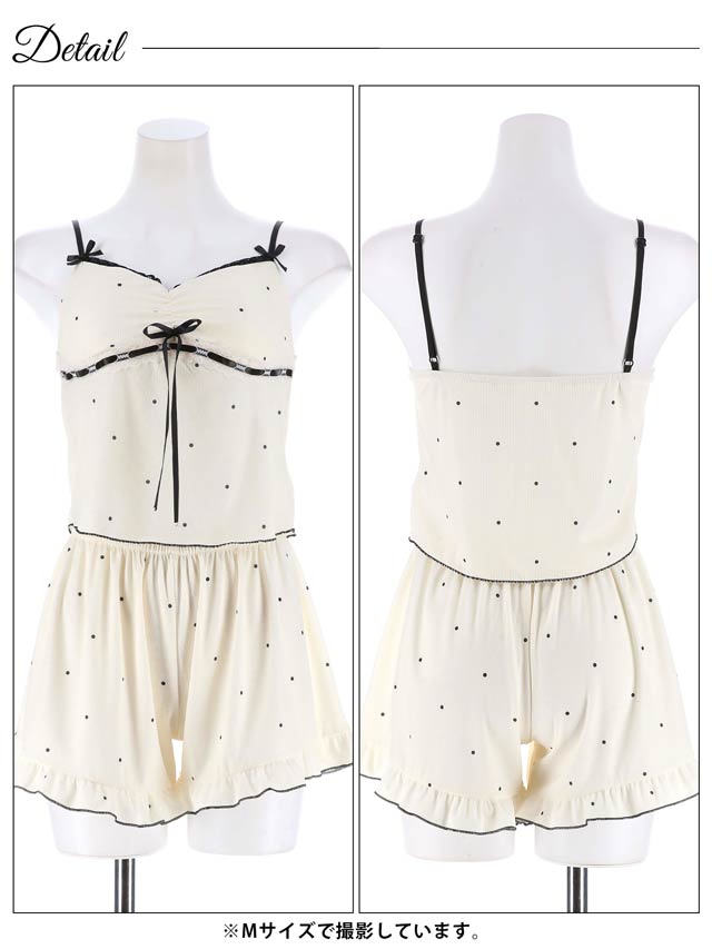 リボン×ドット柄×レースのガーリーさ満点なルームウェアセットアップです。キャミソールはパッド付きで取り外しも可能です。ブラックカラーのドット柄や、アンダーバストのレースとリボンであしらわれたラインがアクセントになっています。柔らかなリブ生地の触り心地がポイントです。