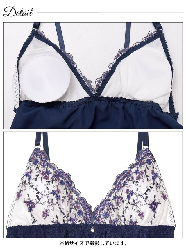可憐に咲く小花刺繍を施した大人フェミニンな印象のランジェリー。胸元にはきらめくビジューチャームをあしらい、華やかさと高級感をプラスしました◎取り外し可能なパッド入りなので、お揃いのブラセットと合わせるのはもちろん一枚でも着用できます!