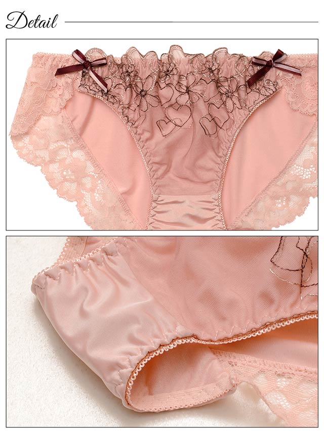 ハートとお花の刺繍をたっぷりとあしらったガーリーな雰囲気のランジェリー。胸元やショーツフロントを飾る2色使いのリボンが可愛らしいアクセントになっています♪ショーツは脚口がレース仕様なので、食い込みにくくヒップに優しくフィットするデザインです◎
