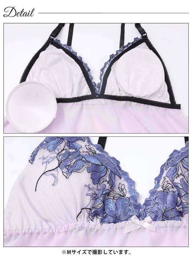 存在感のある大ぶりのフラワー刺繍が目を惹く華やかなランジェリー。胸元にあしらったリボンがフェミニンなアクセントになり、さりげない可愛らしさをプラスします。取り外し可能な付属パッド入りなので、ブラセットと合わせるのはもちろん一枚でもさらっと着用できます◎