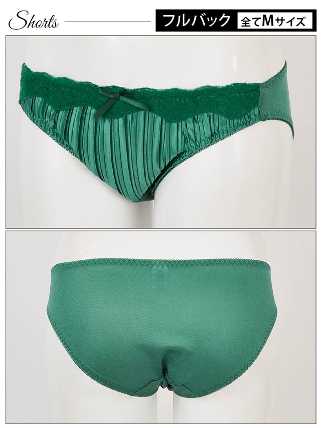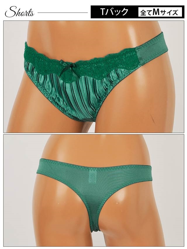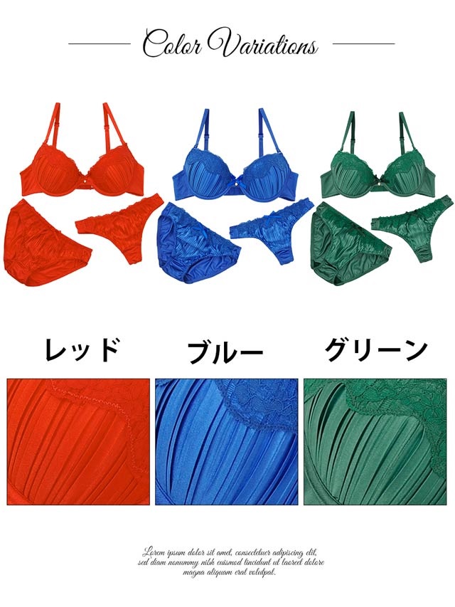 VIVIDカラーが眩しい、華やかなランジェリーが登場♪光沢感あるサテンはプリーツ状になっていて、上品さもプラスしました。カップ上部やショーツには可愛い花柄のコード花柄を飾って女らしさをさらに強調してくれます。シンプルで飽きがこないデザインはどんな場面でも活躍する予感…♪フルバックとTバックのショーツ2枚SETなので、その日の気分で着こなしを楽しめるのも嬉しいポイントです!