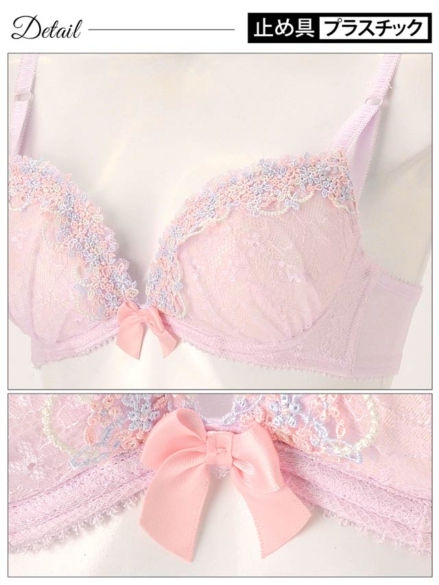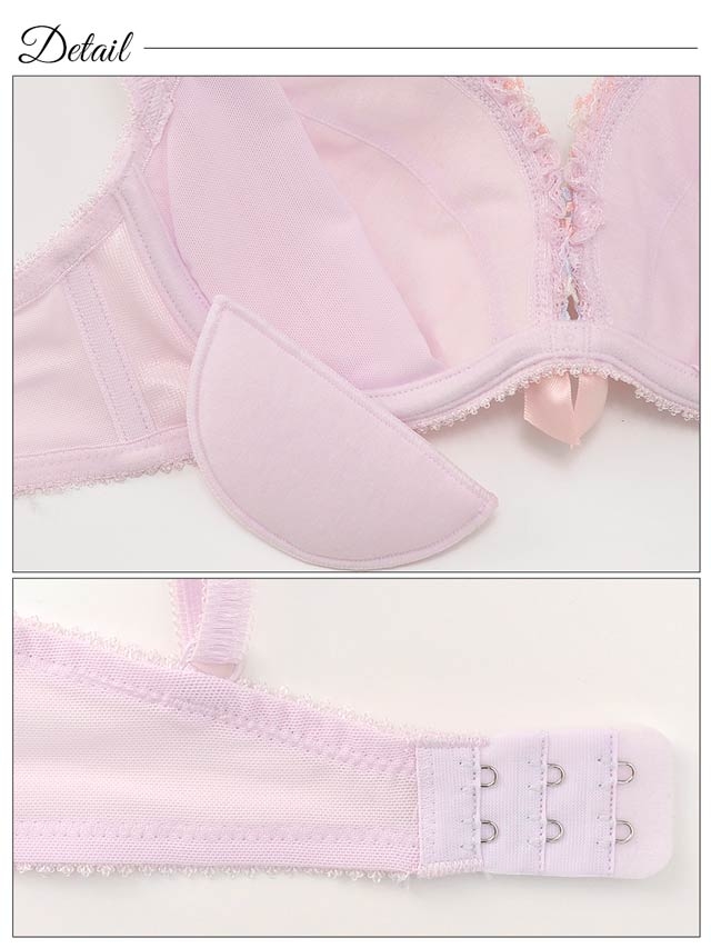 レースと刺繍をふんだんに使ったエレガントなランジェリーが新登場!全体を透け感のあるFlowerレースで彩り、ヌーディーっぽく仕上げました。ブラ上部にはお花畑のような贅沢なFlower刺繍をたっぷりとデコレーション。さらに"盛れる"と好評なトライアングルストラップ構造で脇肉も逃さずキャッチして、自然にバストアップできちゃいます!上品&甘くせめたい夜にぴったり☆