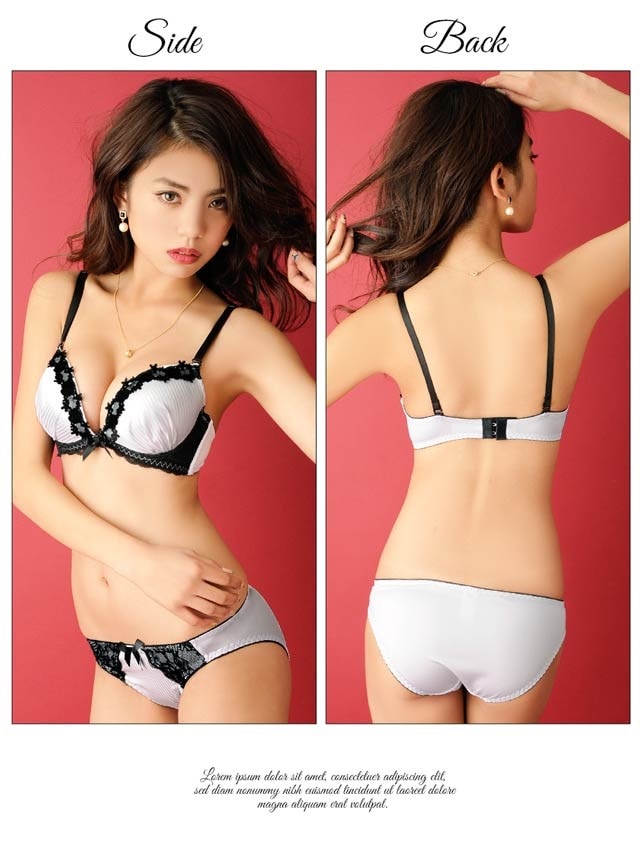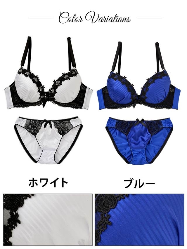 艶々のサテンとブラックレースの組み合わせがSEXYさを醸し出す大人のランジェリー。カップにはさりげなくストライプ柄が描かれているのがおしゃれなPointです!谷間部分にはROSE柄のケミカルレースをあしらい、より一層キレイな谷間を演出してくれます。ショーツはシンプルタイプで履き心地も抜群!