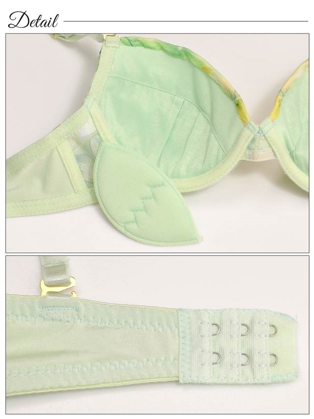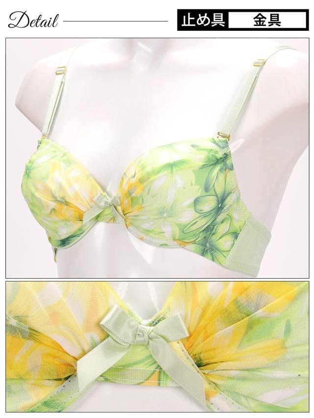 透け感のあるオーガンジー素材にトロピカルFlowerをのせた、これからの季節にぴったりのデザイン♪カラフルなブラは身に着けるだけで気分があがること間違いなし!カップ部分にはギャザーが入っており、バストを立体的にしてくれます!ショーツは履きやすいシンプルタイプ。この夏大活躍しそうなランジェリーです。