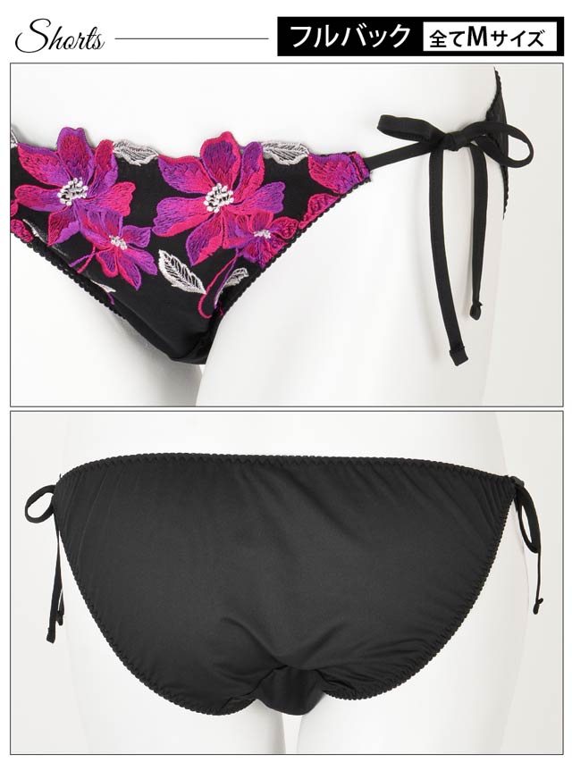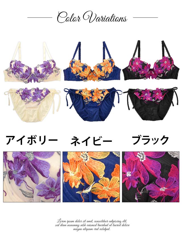 ゴージャスな花柄刺繍を全体に施したRichなブラ★シアーチュールに色鮮やかなビビッドカラーの花柄を大胆に刺繍したインポートランジェリーのような豪華デザイン!!ショーツは彼を虜にするほどけるリアル"紐パン"!濃厚なビビッドカラーが本能を刺激するフェロモン溢れるランジェリーで特別な夜を過ごしてください♪