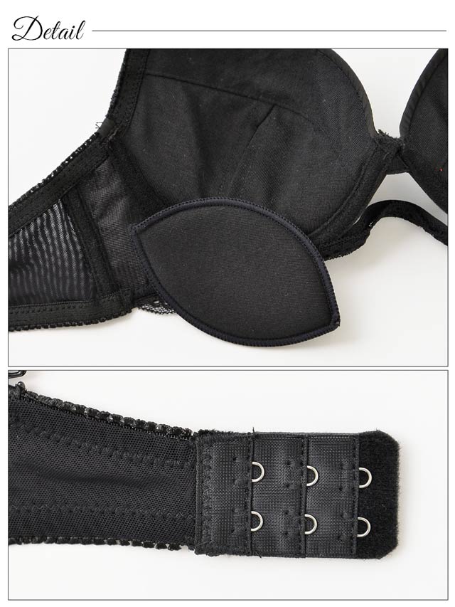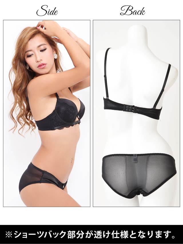 アンダーフロントが大胆に開いたエロティックなレーシィブラ★マットサテンにスカラップレースを飾り上品に仕上げました。フェロモン溢れるフロントホールに思わず目を奪われる超個性派デザイン!!フルバックはヒップが透け透けのシースルー仕様!どこまでもエロい個性派ブラは彼のハートを釘付けにする最強アイテムです★