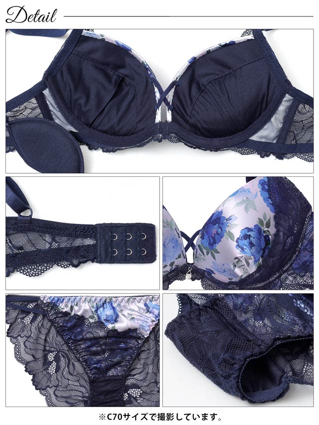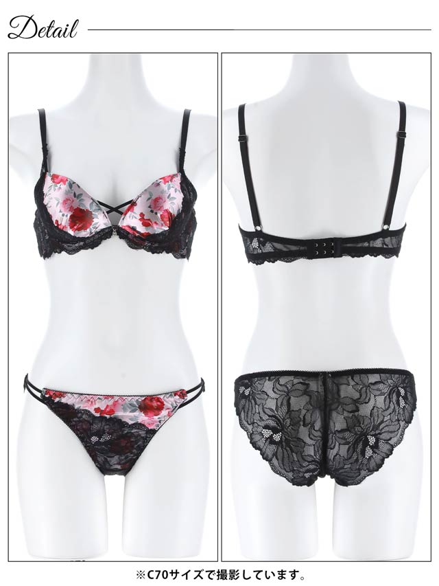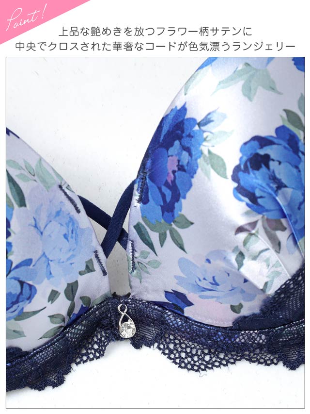色鮮やかなフラワープリントと繊細なレースのコントラストが、大人の魅力を醸し出すランジェリー。胸元のクロスコードやきらめくチャームがアクセントに♪ショーツはWストリング×バック透けレース仕様のセクシーなデザイン。ラインがひびきにくくタイトなお洋服でも安心です◎
