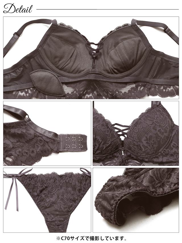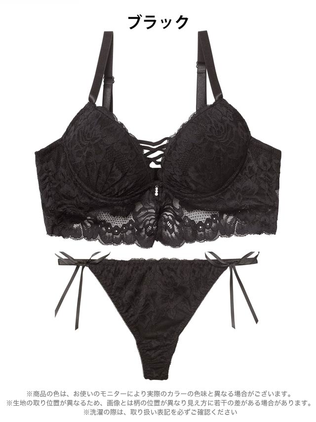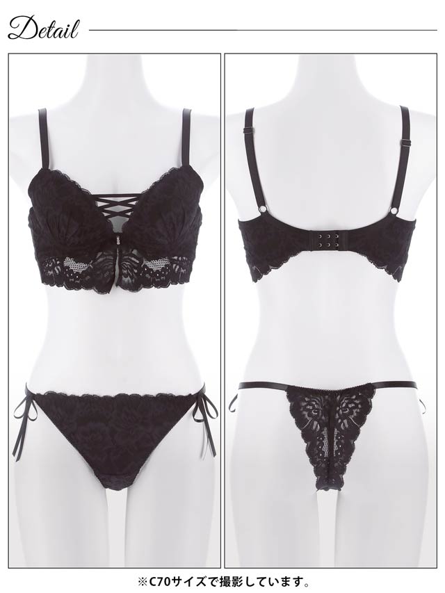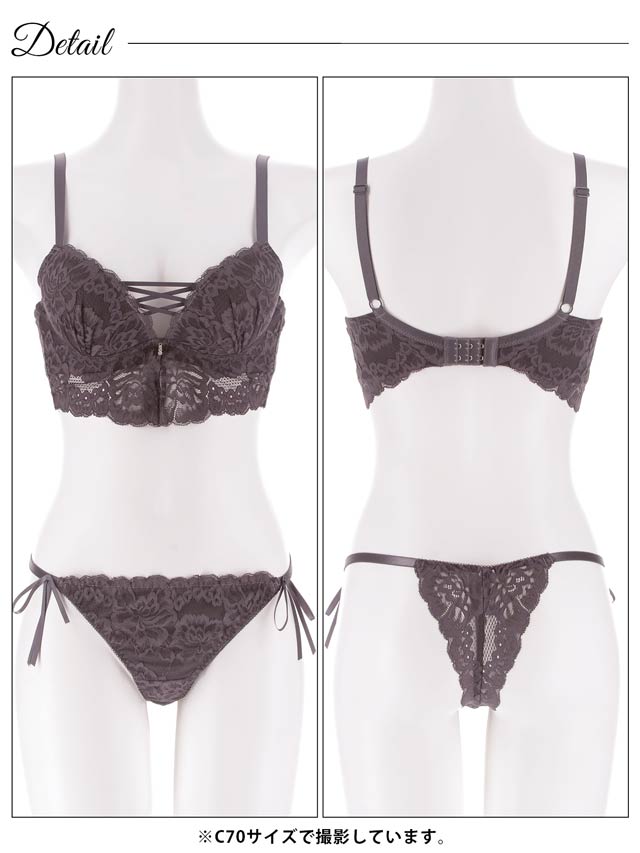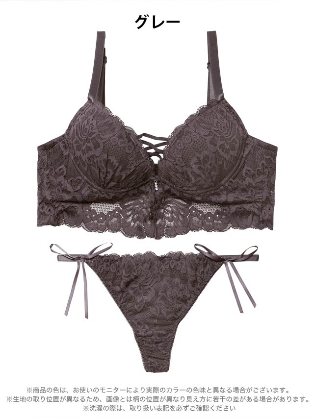 シンプルなモノトーンのレースにレースアップ風クロスコードをあしらった大人セクシーなランジェリー。ビスチェ風に見えるアンダーのレースもポイント!ショーツは素肌が透けるバックレース仕様。サイドのリボンが腰まわりを可愛らしく飾ってくれます◎
