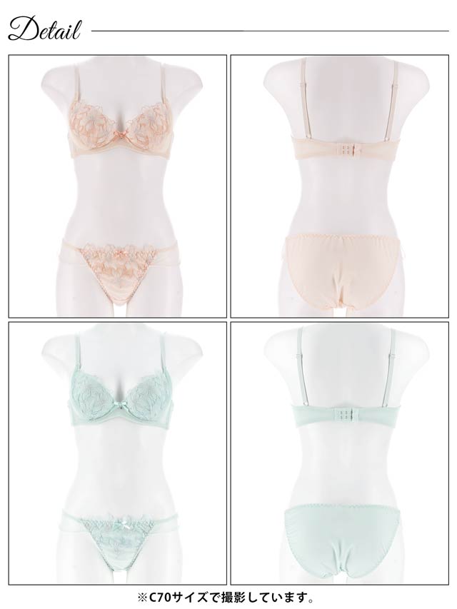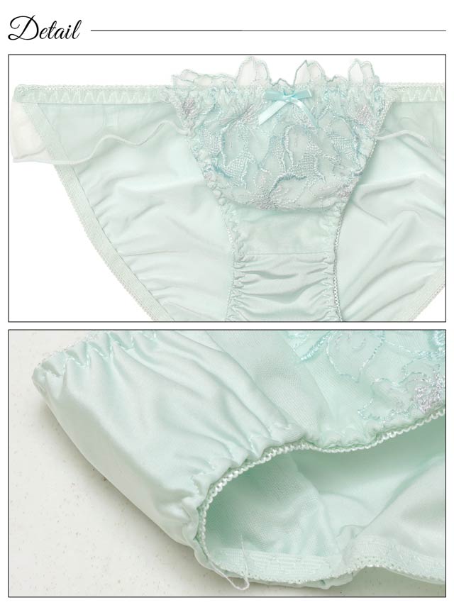 ラメ糸が輝く線画調のフラワー刺繍を施した大人フェミニンなデザインのランジェリー。カップを飾るチュールや、中心のリボン&チャームも可愛らしいポイント♪ショーツサイドは透け感のあるフリル仕様で腰元をさりげなく透け見せします◎
