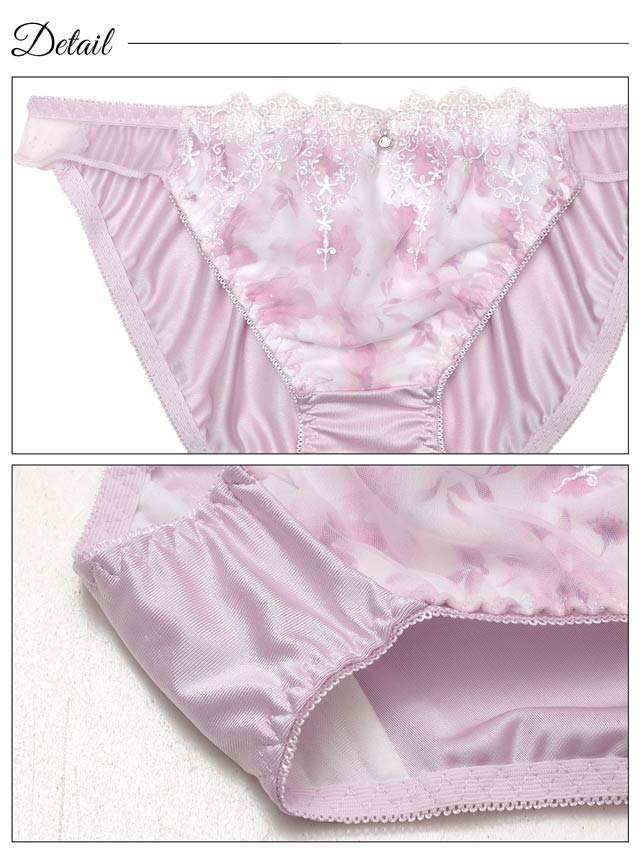 フラワープリントをあしらったカップに、繊細な刺繍のチュールレースとシフォンを重ねたランジェリー。ふんわりと軽やかなシフォンが優雅でフェミニンな雰囲気を演出します♪ショーツはデイリー使いに最適なフルバック仕様。サイドのさりげない透け感がポイントです!