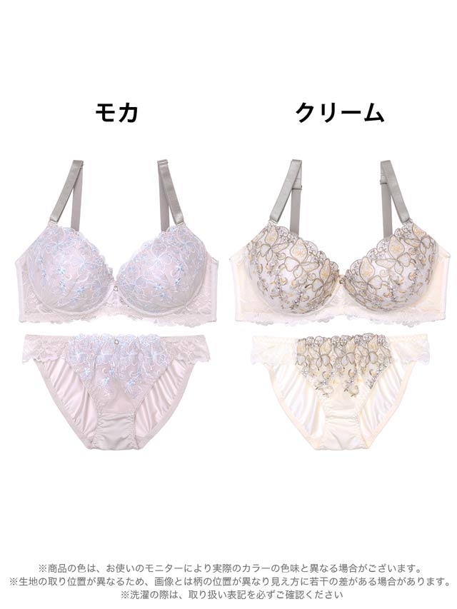 女の子らしい柔らかいペールカラーにリーフや小さな花々の刺繍を贅沢にあしらったランジェリー。繊細なサイドレースから覗く素肌透けが甘さの中にもセクシーな印象をプラスします◎ 場面を問わず使いやすい安心安定のフルバック仕様です。