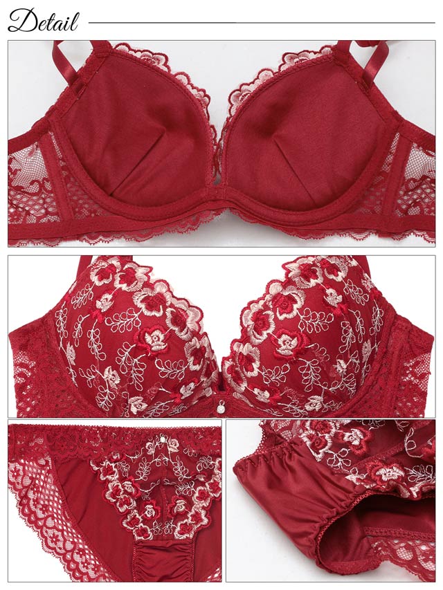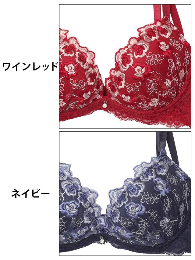 豪華なフラワー刺繍と深みのあるカラーリングが目を惹く、大人×セクシーな雰囲気のランジェリー。胸元にあしらったシルバーチャームが上品な輝きをプラスします◎ショーツの脚口はレース仕上げで、ラインがひびきにくいのも嬉しいポイントです!