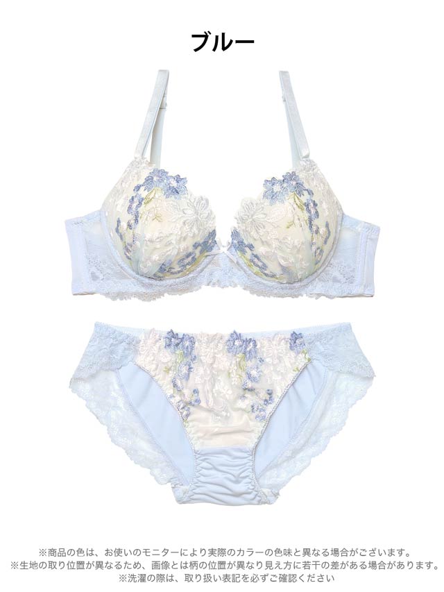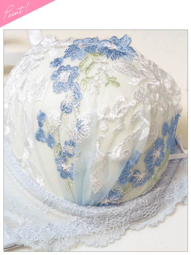 女の子らしい優し気なパステルカラーに清楚感溢れるフラワー刺繍をあしらったランジェリー。バスト中央の華奢なワンポイントリボンで甘さをちょっぴりプラス♪ 繊細なレース生地から透ける上品な素肌見せが大人かわいい1着です。
