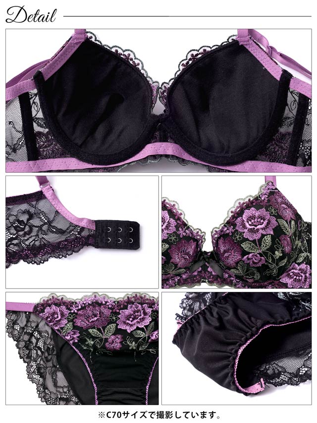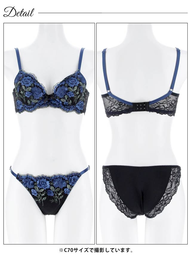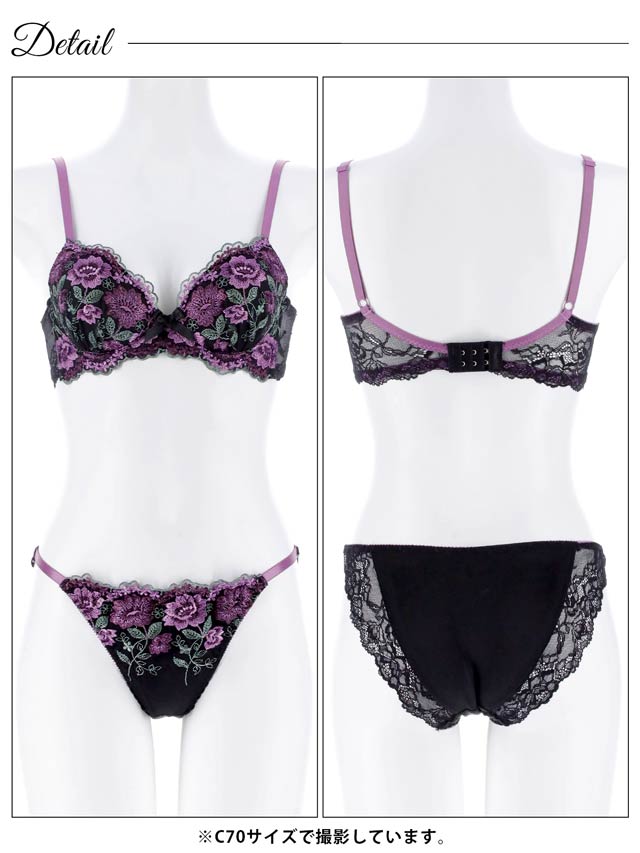 黒地に濃色のフラワー刺繍が映える、大人セクシーで豪華なデザインのランジェリー。胸元にあしらったさりげないリボンが可愛らしいアクセントに♪ショーツサイドは色っぽいストリング仕様で、腰元を華奢に見せてくれるのもポイントです。