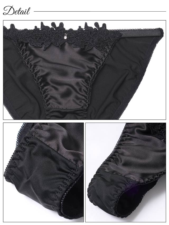 滑らかなサテンに美しいフラワーモチーフのケミカルレースを飾ったランジェリー。バストをぎゅっと寄せるようなクロスコードが目を惹くセクシーさも抜群のデザイン♪フルバック・Tバックが両方ついているので場面に応じて使い分けできちゃいます!