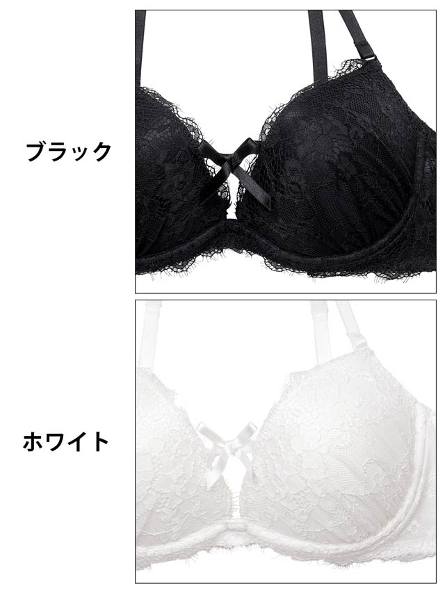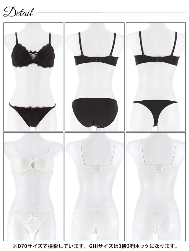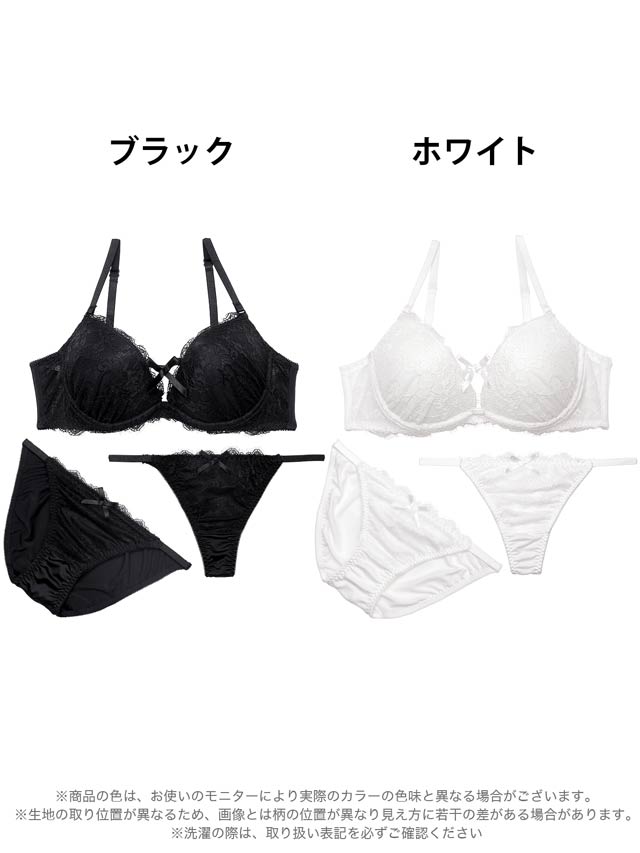儚げなモノトーンのレース生地が女性らしさ際立つランジェリー。谷間に差し掛かるリボン×コードが視線を引き寄せるワンポイント。華奢なストリングを使用したセクシーなフルバック、Tバックがお好みで変えられる3点セットです。