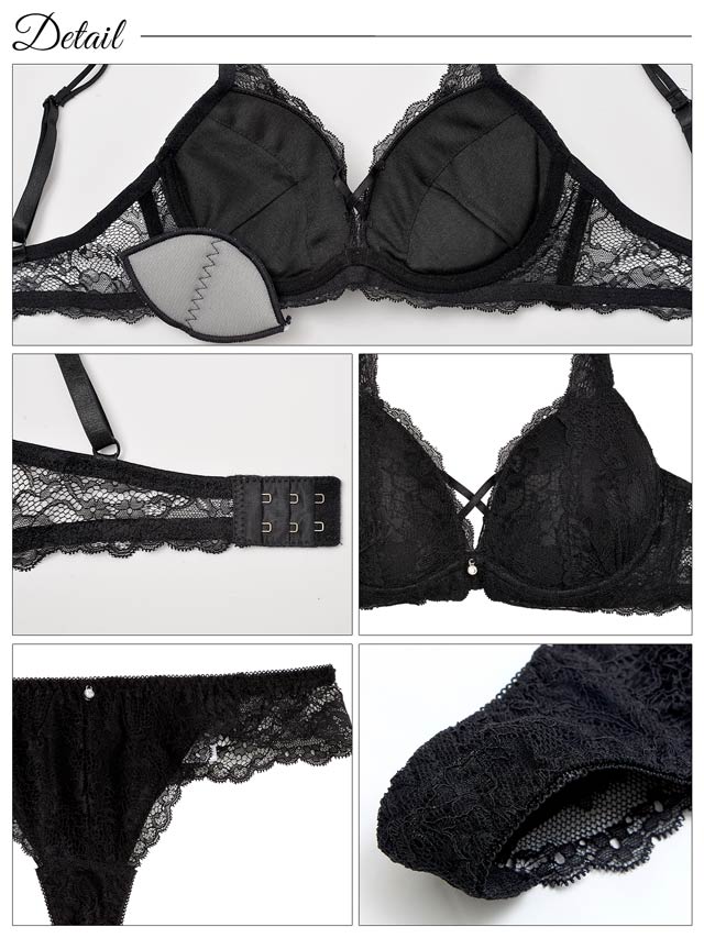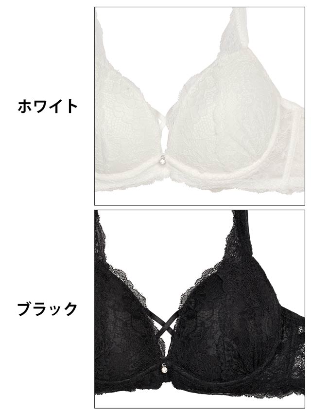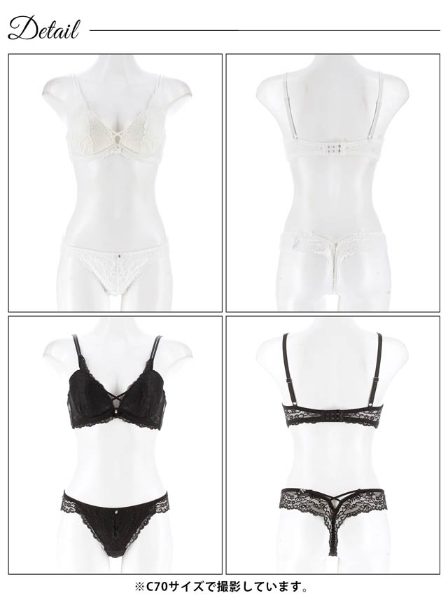 女性らしさ漂う上品な総レースのランジェリー。谷間にかかるクロスコードやきらめくラインストーンチャームがアクセント♪ショーツはバック透け仕様でセクシーかつお洋服に響きにくいのもポイントです◎