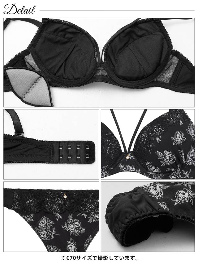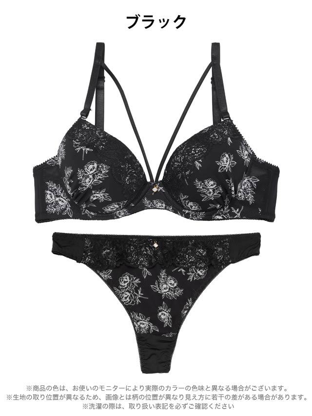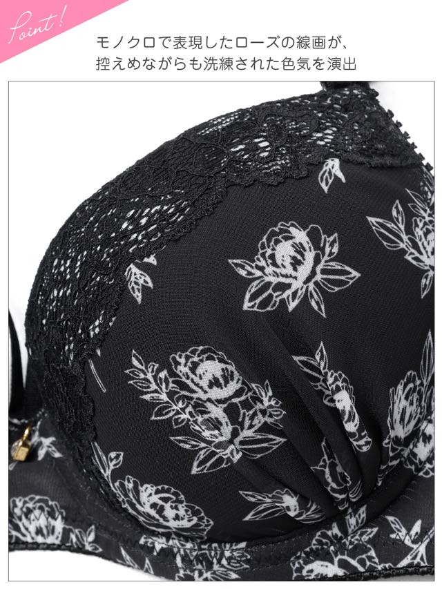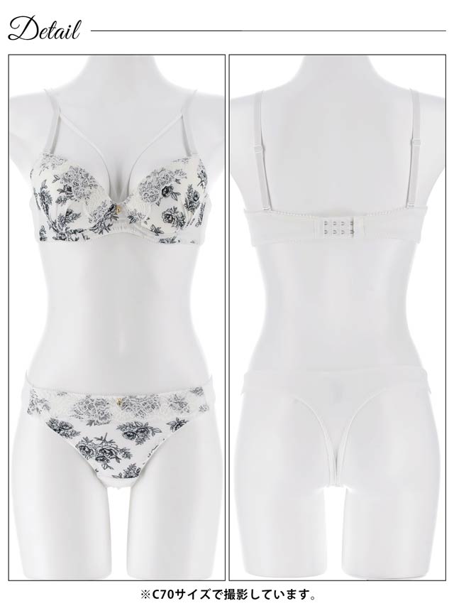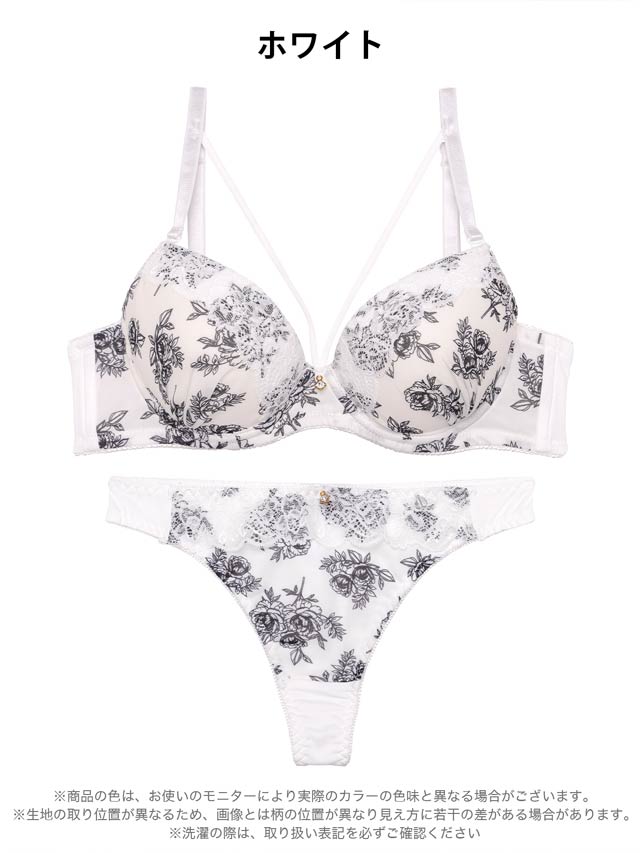 モノトーンのフラワープリントとレースを組み合わせた、大人の女性らしさ漂うランジェリー。きらりと光るビジューチャームがさりげないアクセントになっています♪胸元にはバストを強調するコードをあしらい、セクシーさも兼ね備えたデザインです◎