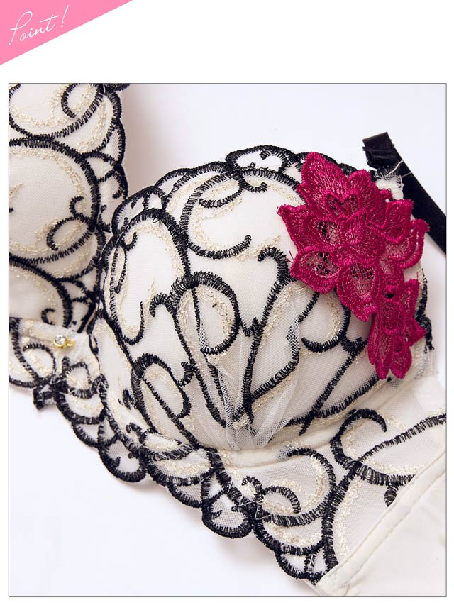 繊細な曲線刺繍レースが上品なランジェリー。片側のフラワーモチーフがアクセントになり華やかな印象を演出します♪ショーツはストリング仕様で腰元を美しく魅せます◎気分を上げたい日にもデイリーにも使いやすい一着です。