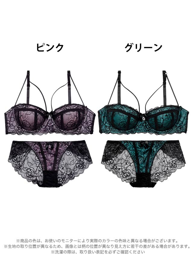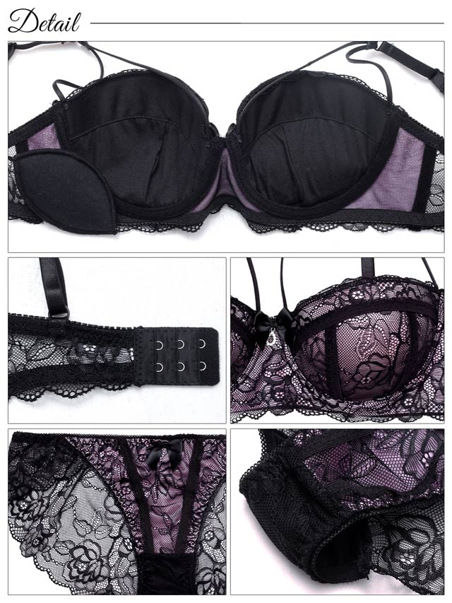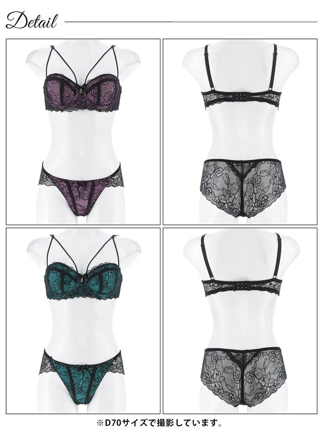 透け感のある繊細なブラックレースやバストを強調するコードデザインがセクシーさ満載のランジェリー。しっかり盛れるダブルパッド×ハーフカップ仕様で、美しいデコルテラインを演出♪総レースのショーツはお洋服にひびきにくいだけでなく履き心地も快適です◎