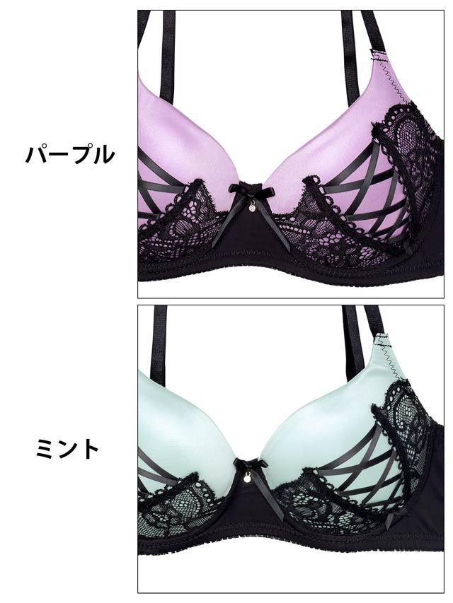艶のある淡いカラーのカップに、ブラックのレースアップが映える甘め×セクシーデザインのランジェリー。胸元のリボン&チャームがさりげない可愛らしさをプラス♪ショーツは色っぽく透けるバックレース仕様でお洋服にひびきにくいのも嬉しいポイントです!