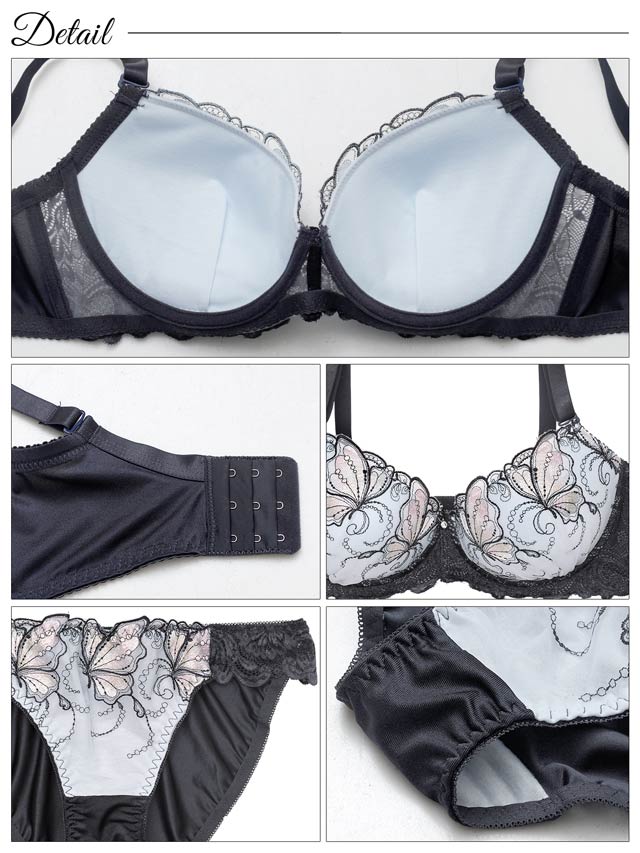 美しい色彩で描かれた蝶の刺繍が目を惹くエレガントなランジェリー。繊細なレースと中央に輝くラインストーンチャームが胸元を華やかに彩ります♪脇高設計でバストを逃がさずしっかりと寄せ上げ、谷間&美シルエットをキープできる1着です!