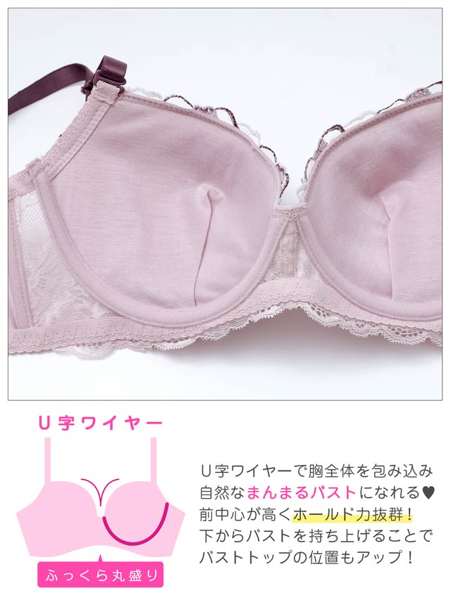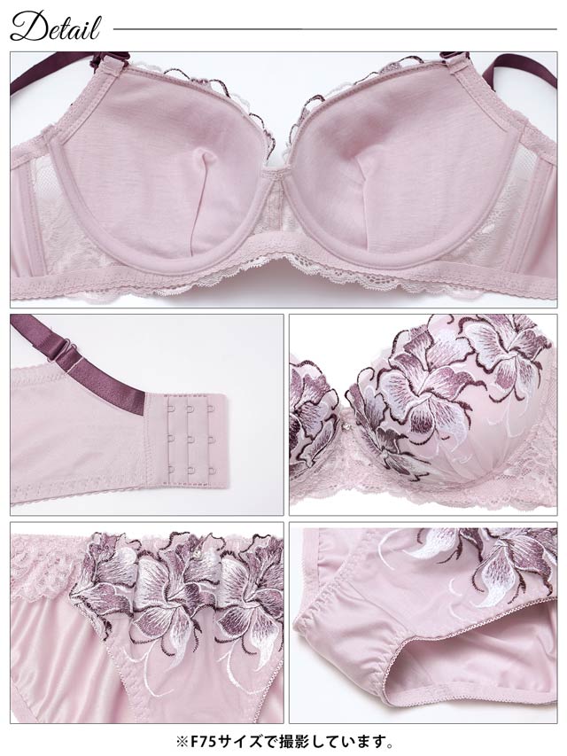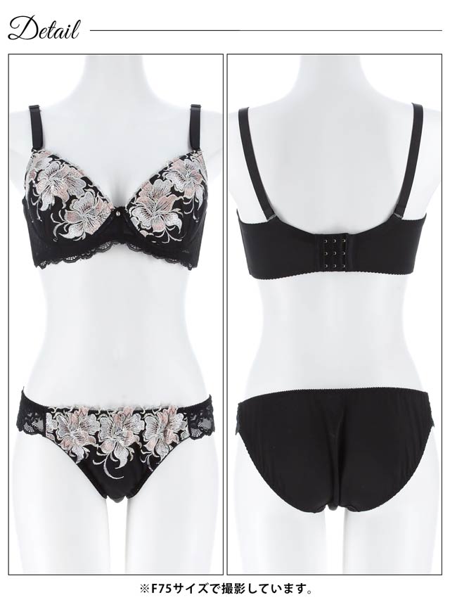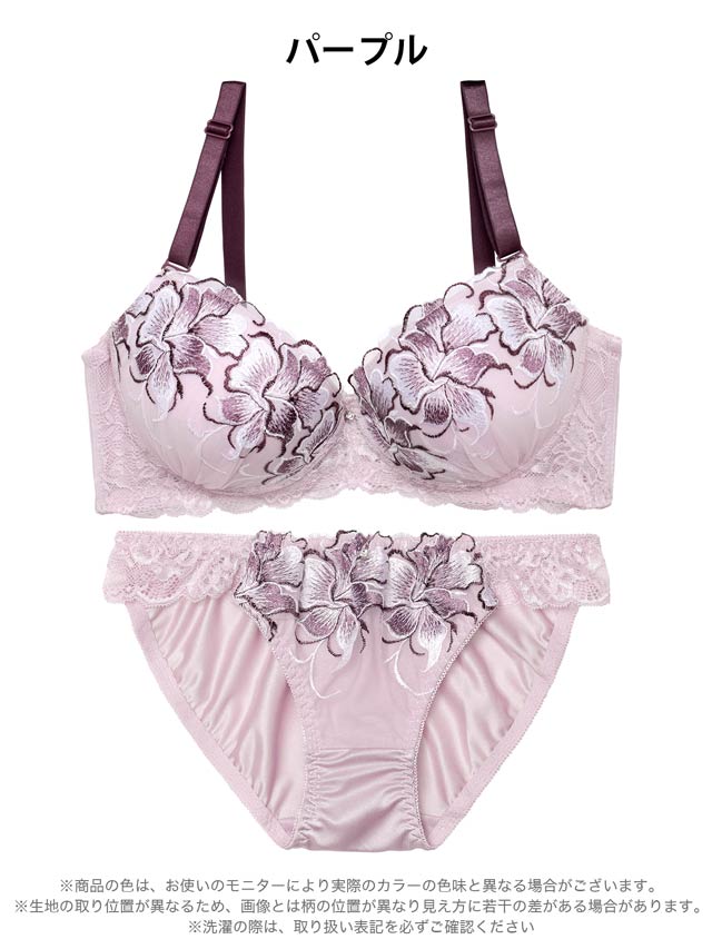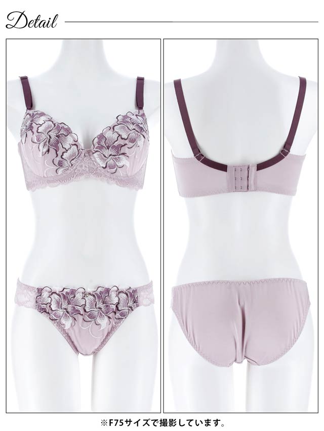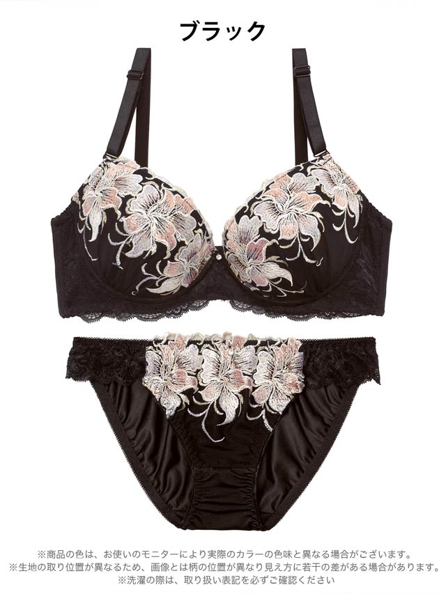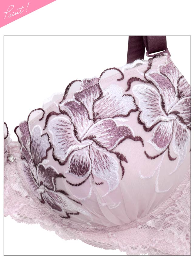 大ぶりな花の刺繍が目を惹くランジェリー。存在感のある刺繍がバストを華やかにします♪レースの透け感で大人の色気を演出。脇高仕様なのでバストを美しく持ち上げます◎