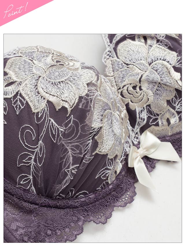 大柄のローズ刺繍が胸元を彩る、華やかで高級感のあるランジェリー。中心には大きなサテンリボンをあしらい、大人っぽいデザインの中に程よく甘さをプラス♪ショーツはサイドに透け感のあるレースを使用し、軽やかで女性らしい印象に仕上げました。