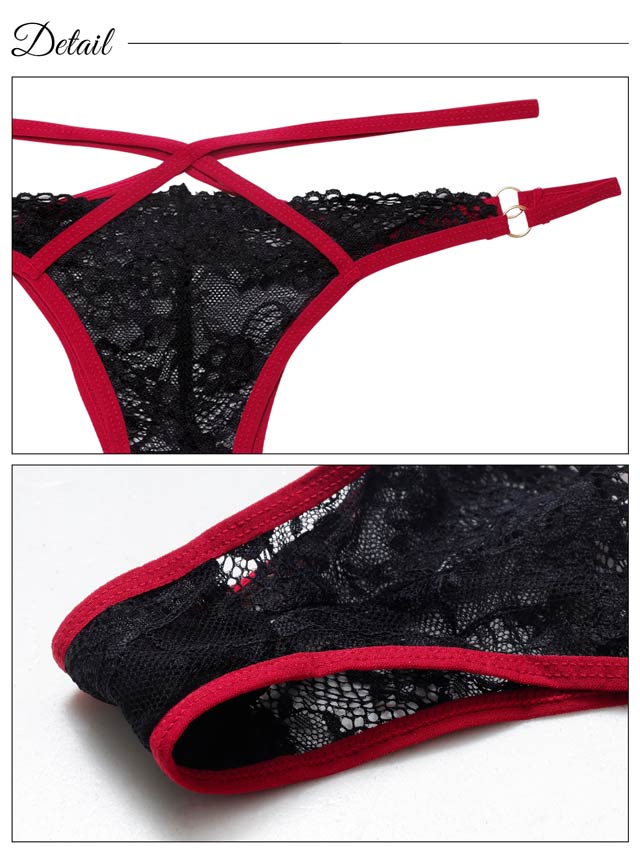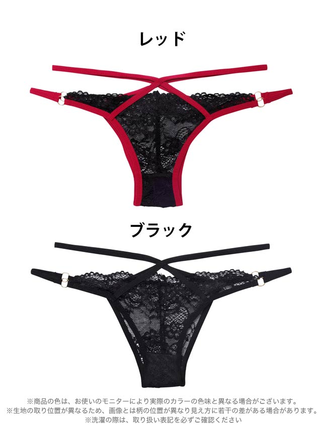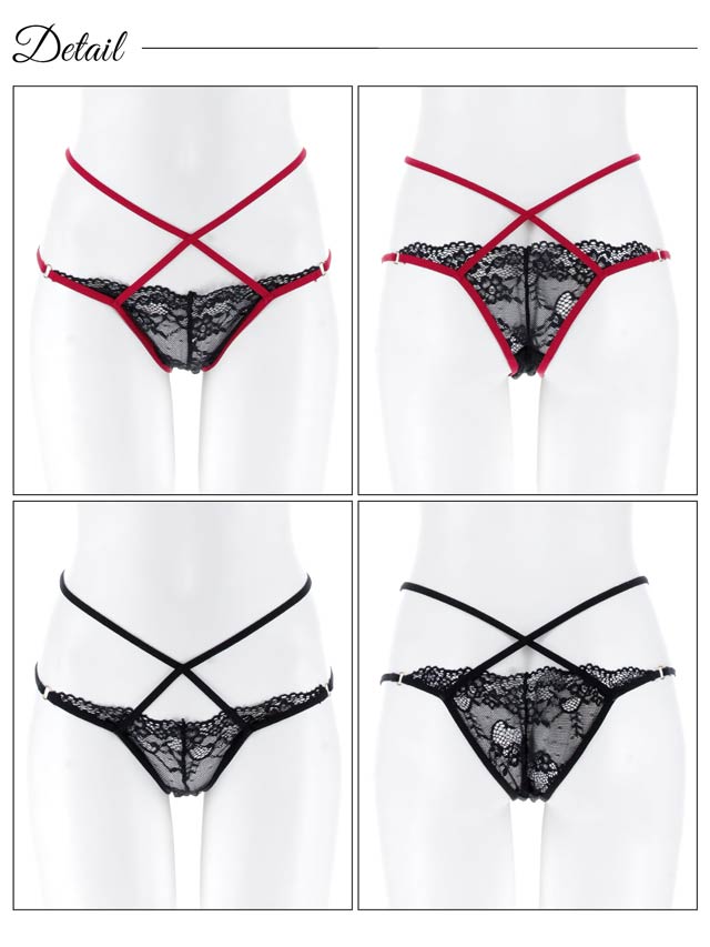 前後にあしらったクロスコードがアクセントになり、女性らしさを引き立てる単品ショーツ。素肌が透ける繊細なレースがより一層セクシーな魅力を漂わせます♪ワントーンでクールにまとめたブラックと、コードの配色が目を惹くレッドの2色展開です◎