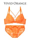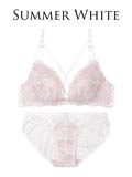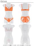 爽やかなカラーリングのボタニカル柄レースが上品で洗練された印象を与えるランジェリー。谷間やショーツフロントには華奢なマカロニコードを飾り色気溢れるルックスに。バックは素肌が透けるレースで後ろ姿まで美しく演出してくれます。