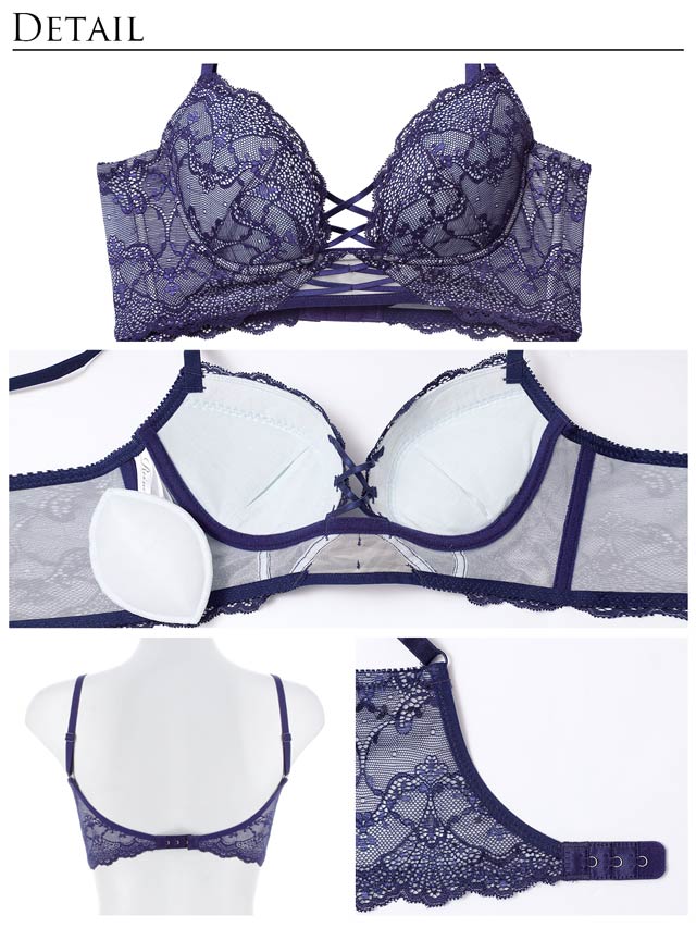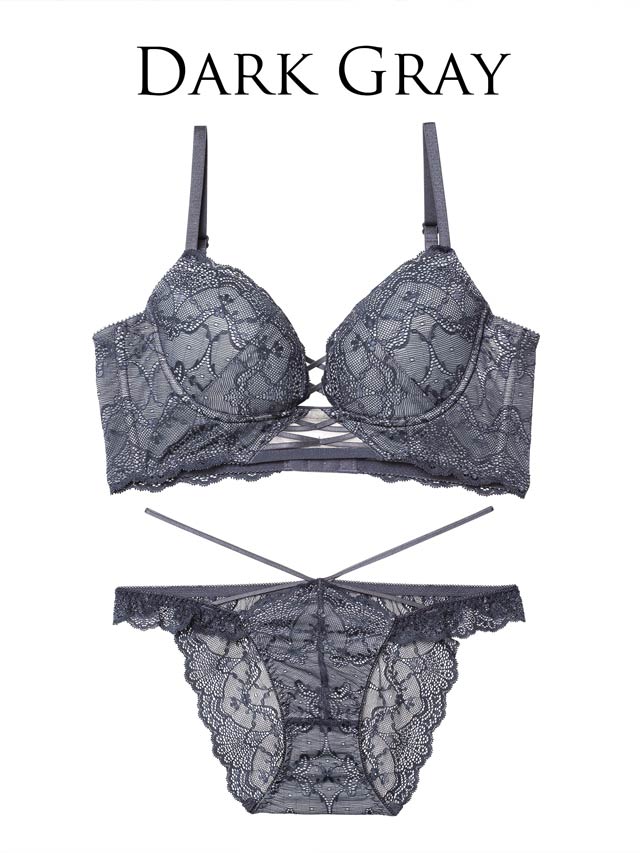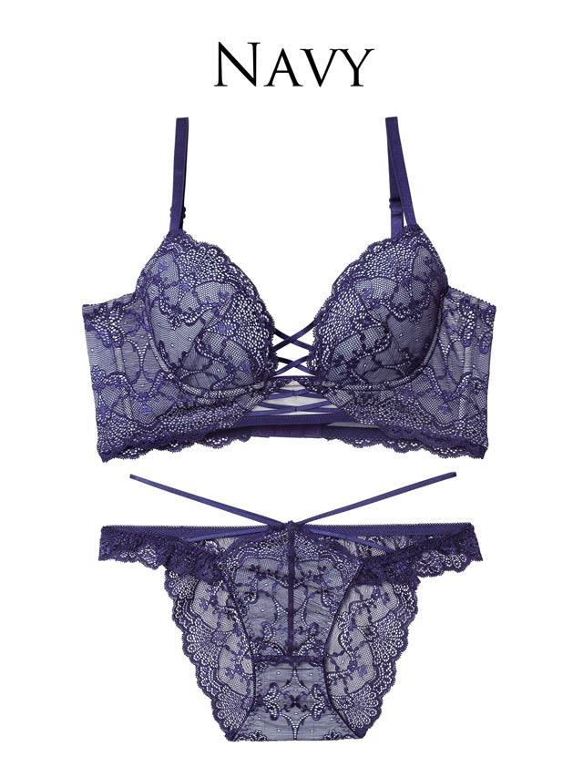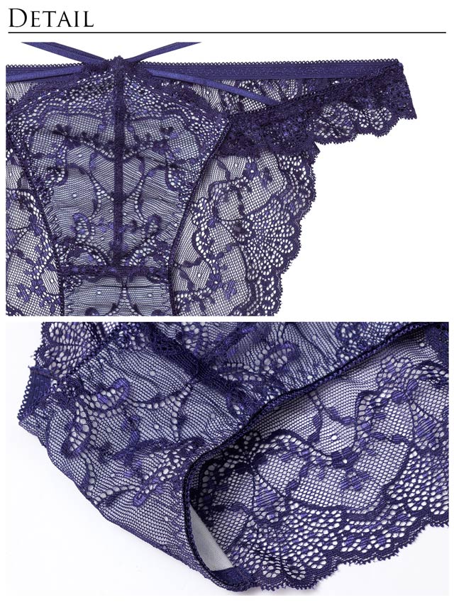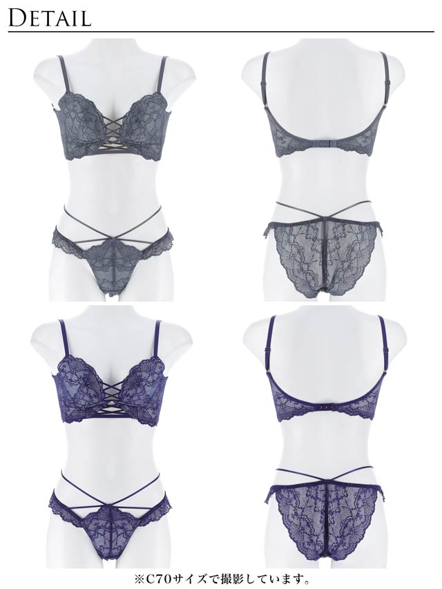 繊細なレースと編み上げたコードがセクシーなランジェリー。胸元や腰元のコードがバストやウエストを綺麗に惹きたてます。背中が大きく開かれたデザインになっていて後ろ姿を綺麗に魅せてくれます。