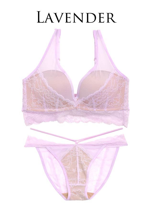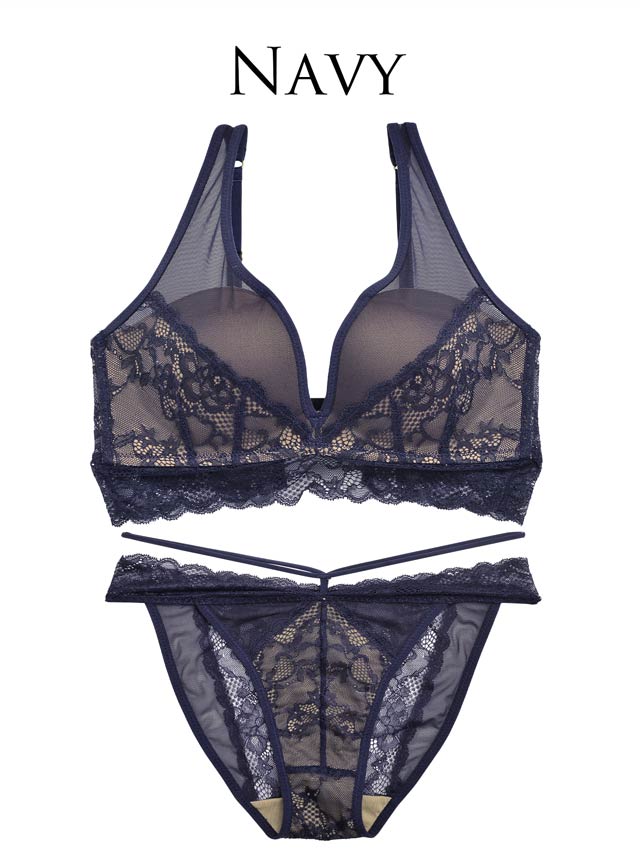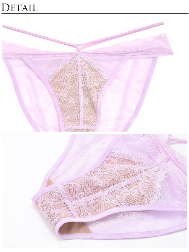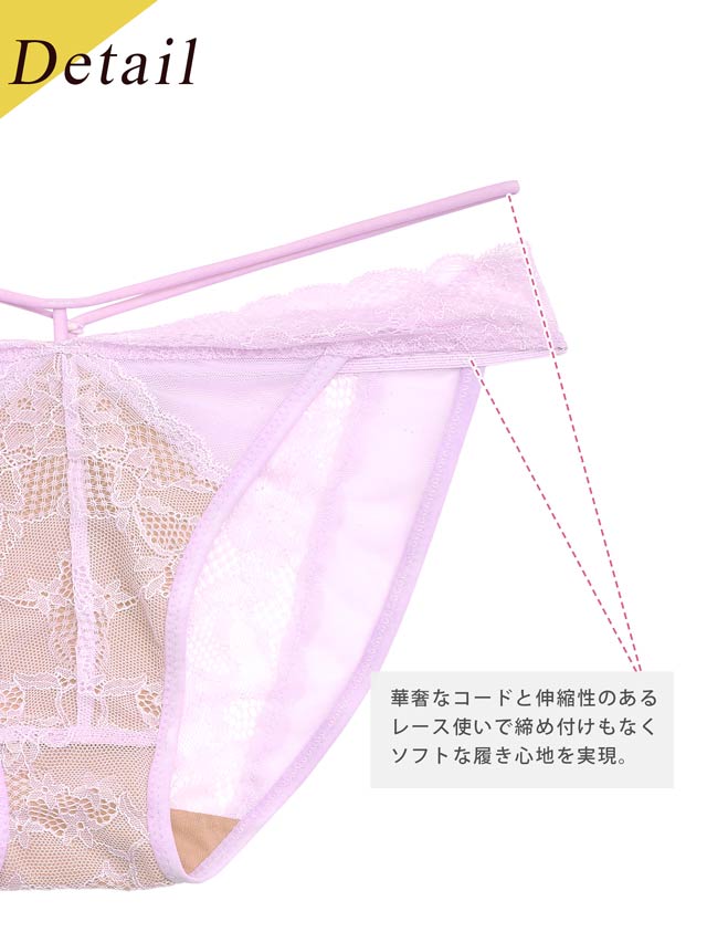 ショーツはマカロニコードと伸縮性のあるストレッチレースの組み合わせでストレスフリーな仕様になっています。 ボトムバックは透け感のあるレースを使用し、肌当たりもなめらかです。