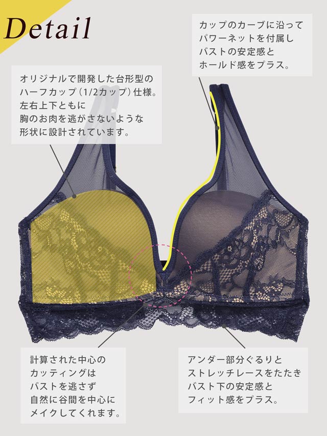 カップ上辺まで続くパワーネットがバストを自然に引き上げてくれるので美バストが叶い、しっかり支えてくれる仕様です。 パッドポケット付きなので、お好みでパッドを入れることができます。