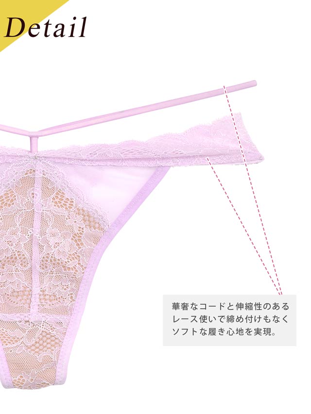 ショーツはマカロニコードと伸縮性のあるストレッチレースの組み合わせでストレスフリーな仕様になっています。 ボトムバックは透け感のあるレースを使用し、肌当たりもなめらかです。