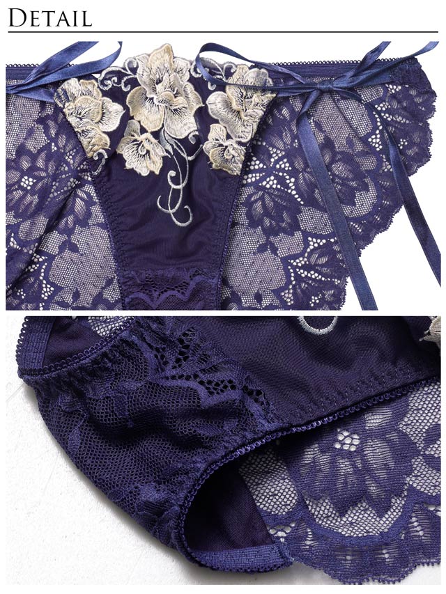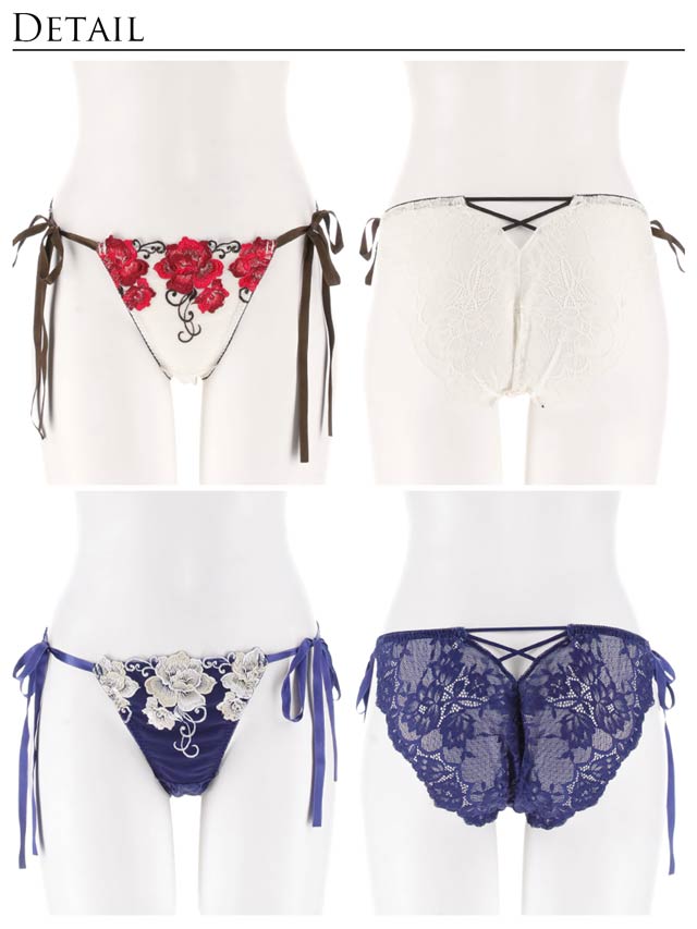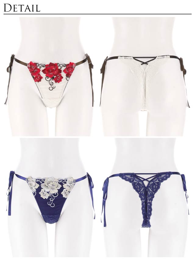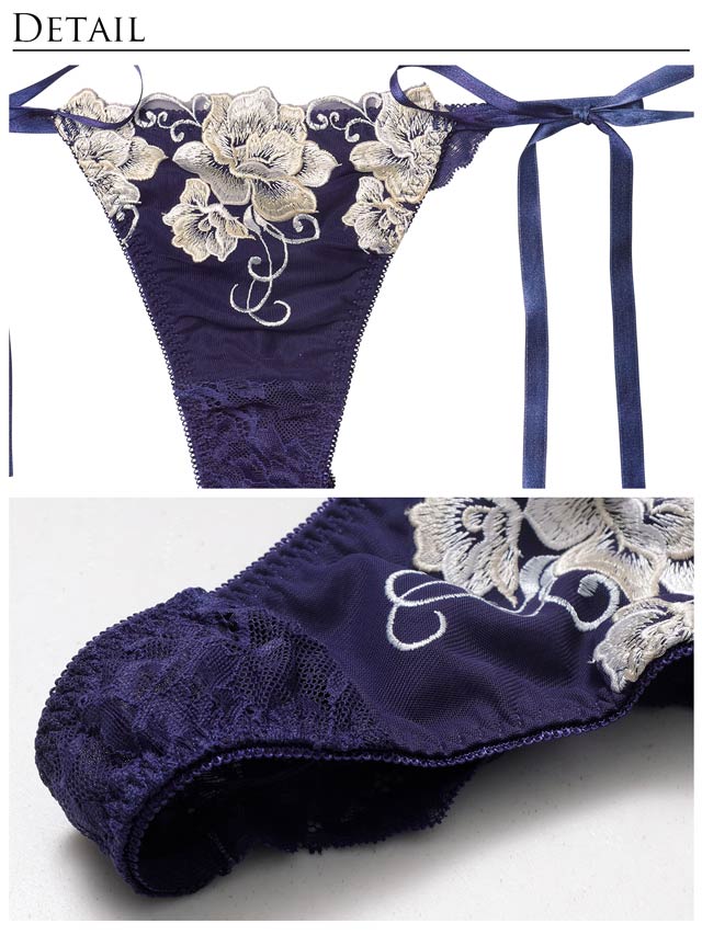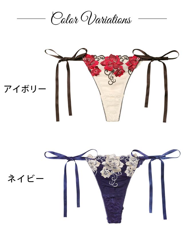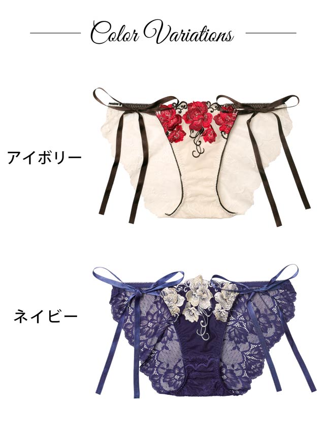立体的な大輪のローズ刺繍が咲き誇り、存在感を放つラグジュアリーなランジェリー。コントラストを効かせた色使いで刺繍をより一層美しく引き立たせます。サイドはリアルに解ける手結びリボン仕様。艶やかなサテンリボンで甘さと色っぽさを兼ね備えたデザインです。