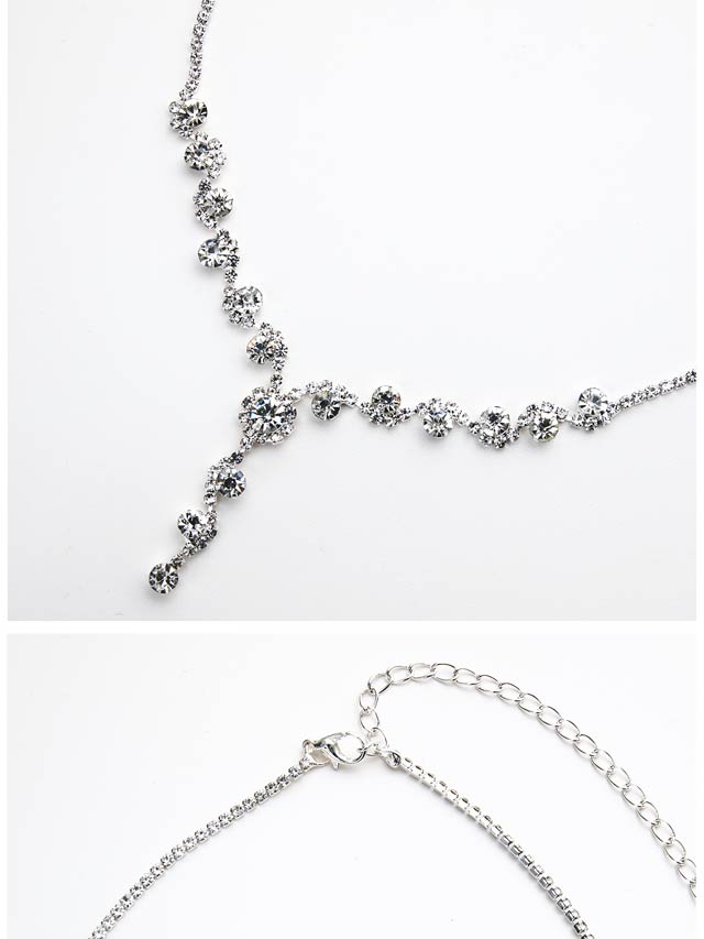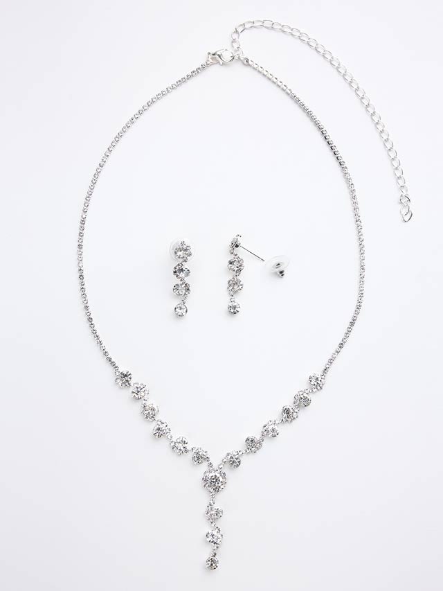 お顔周りを明るく魅せるシルバービジューを贅沢に使用したアクセサリーセット。Vラインのネックレス中央から滴り落ちるようなドロップデザインが首元をヘルシーに演出します。どんなドレスとも合いやすく華やかな印象をプラスしてくれるアイテムです。