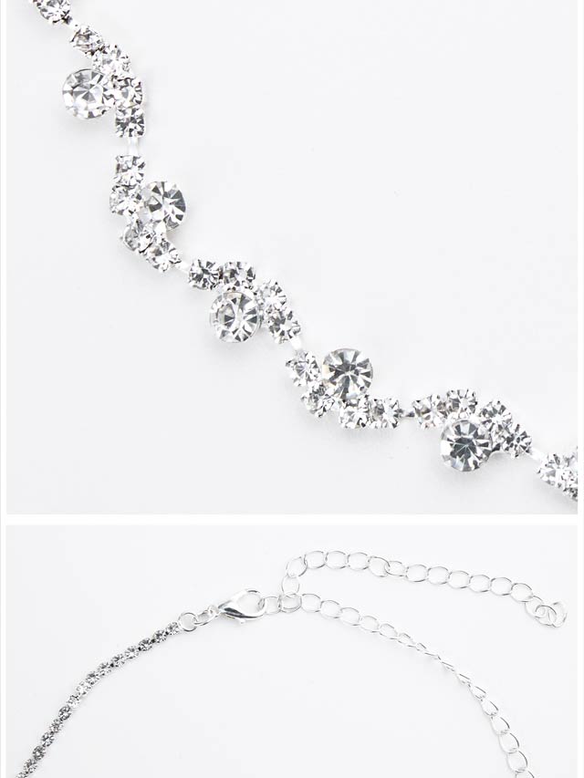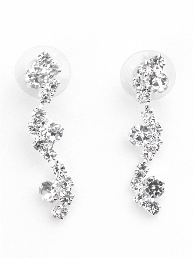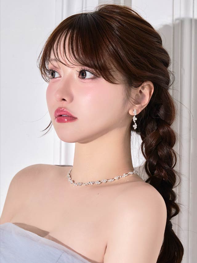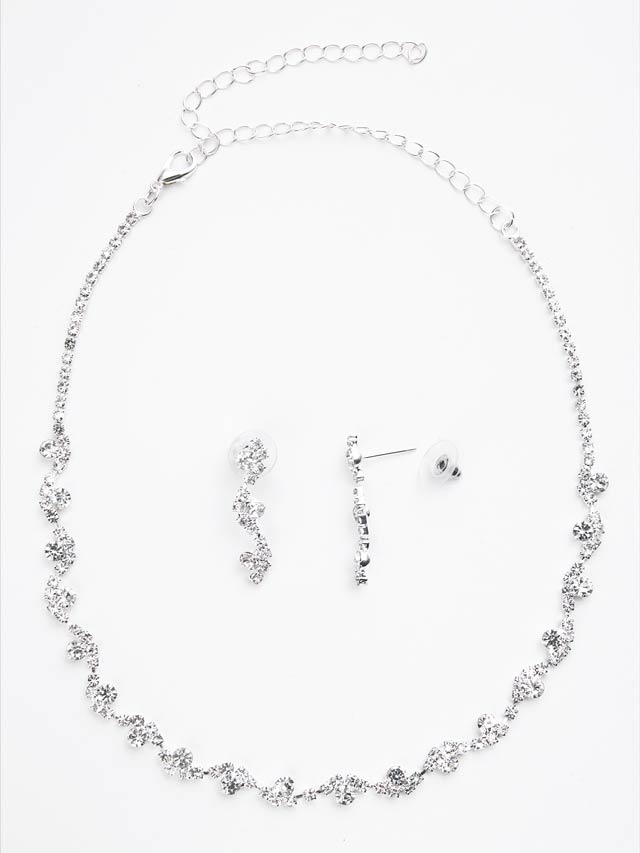 繊細に揺れるようなウェーブラインに、きらめくラインストーンをあしらったネックレス&ピアスセット。首元に沿う美しいシルエットがデコルテを華やかに引き立て、上品な存在感をプラスします。キャバドレスにはもちろん、結婚式やパーティーシーンにも活躍する万能アイテムです。