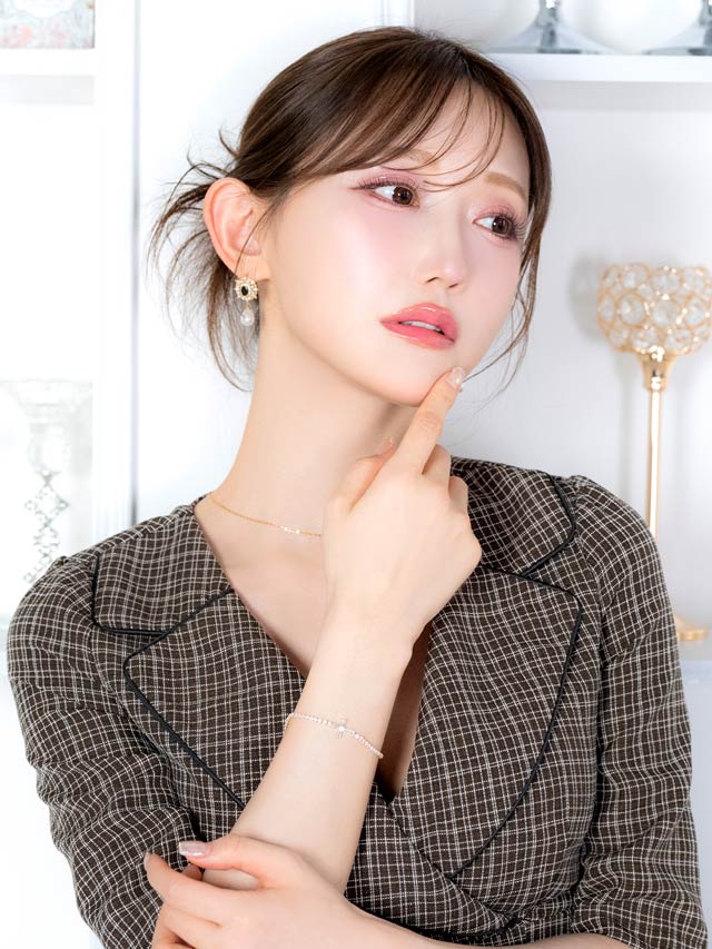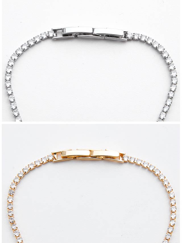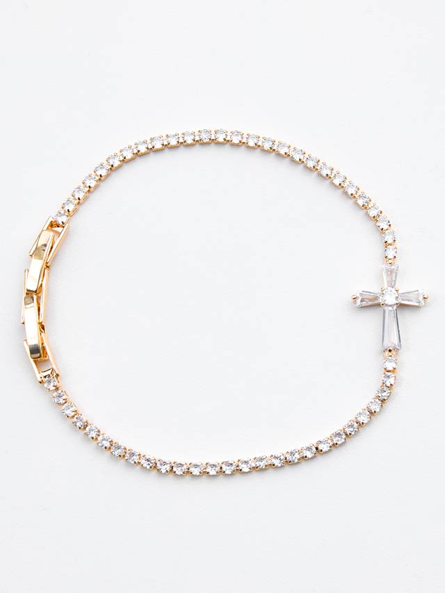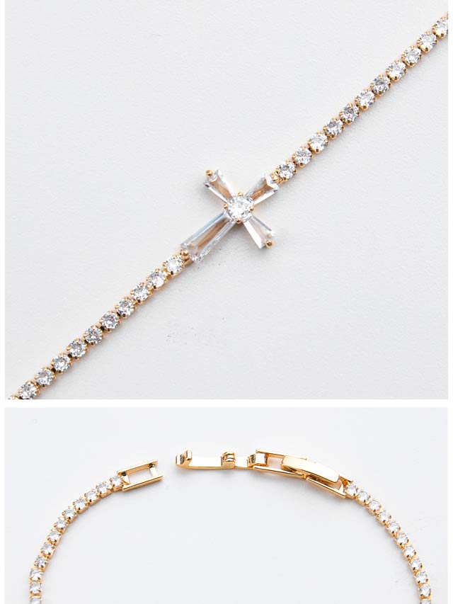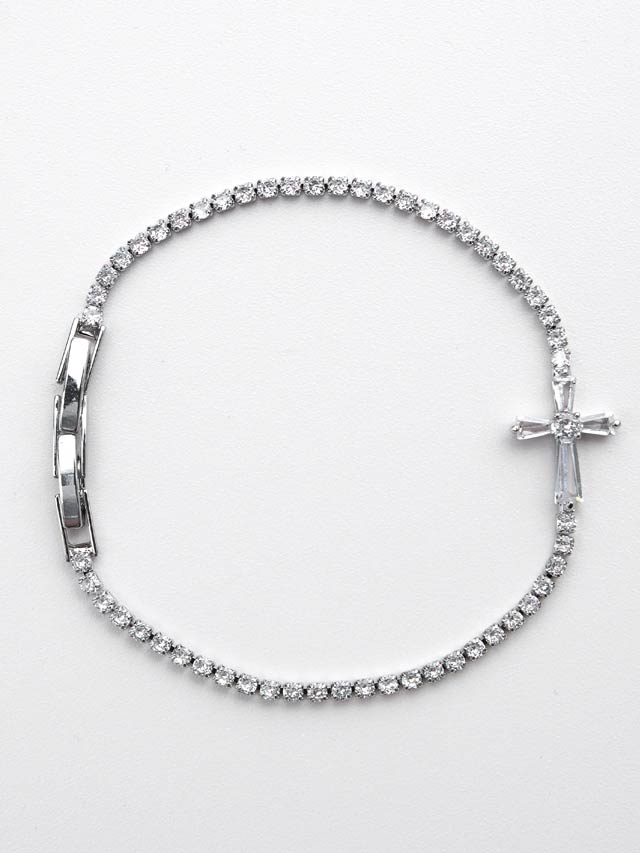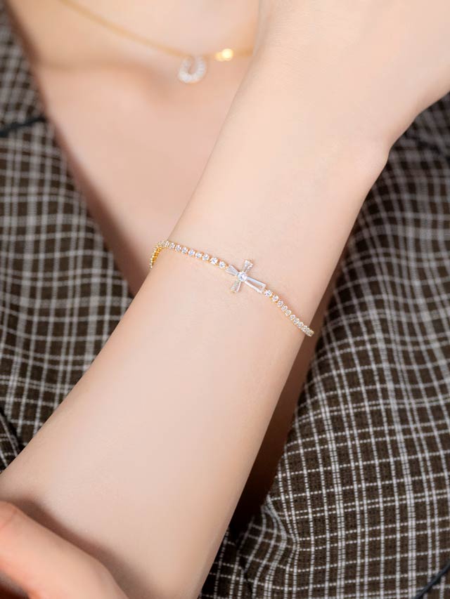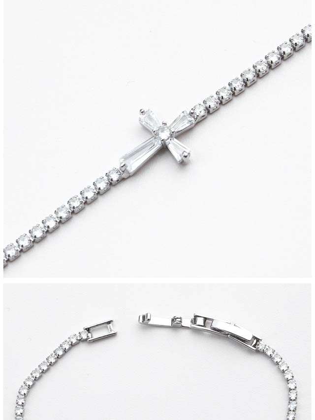 繊細な輝きを放つ中央のクロスビジューが手元を美しく彩るブレスレット。取り外しも簡単な華奢なチェーンデザインが女性らしさを際立たせます。お仕事やパーティーシーンに加え、普段使いもしやすいアイテムです。