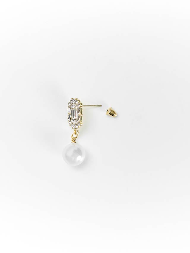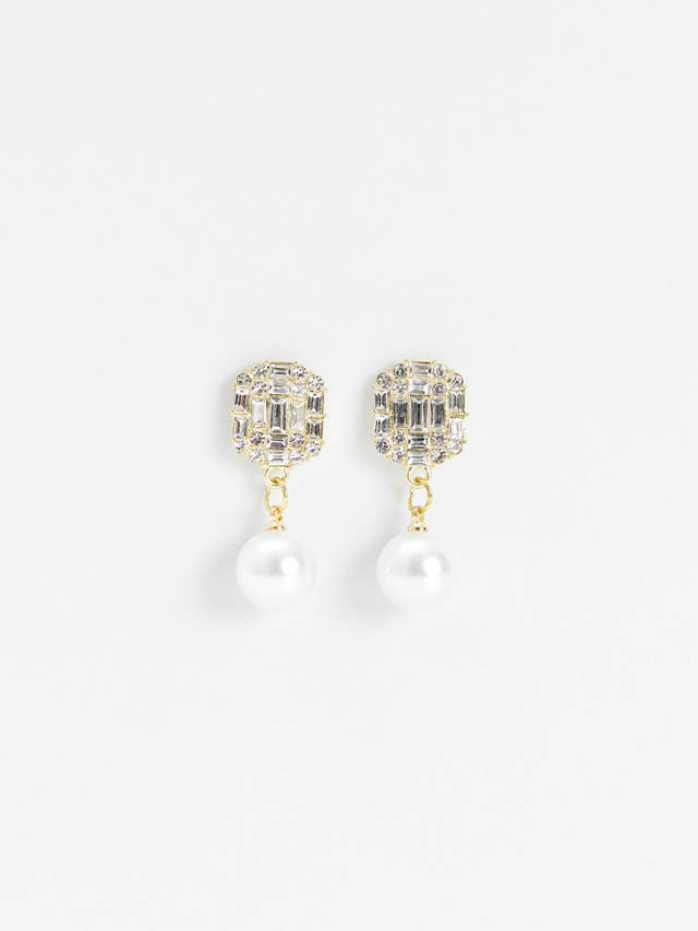 細かいスクエアビジューやラインストーンに大粒なドロップパールが存在感溢れるピアス。お顔周りからゴージャス感漂う雰囲気に仕上げてくれる格上げコーデにぴったりなプラスワンアイテム♪ キャバドレスはもちろん、結婚式やパーティーシーンなどにもぴったりです◎