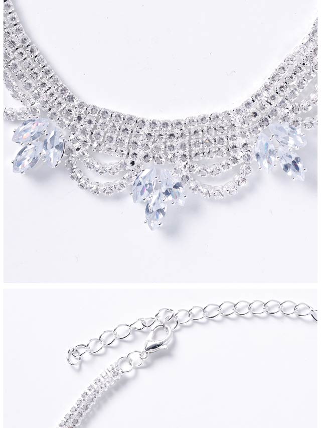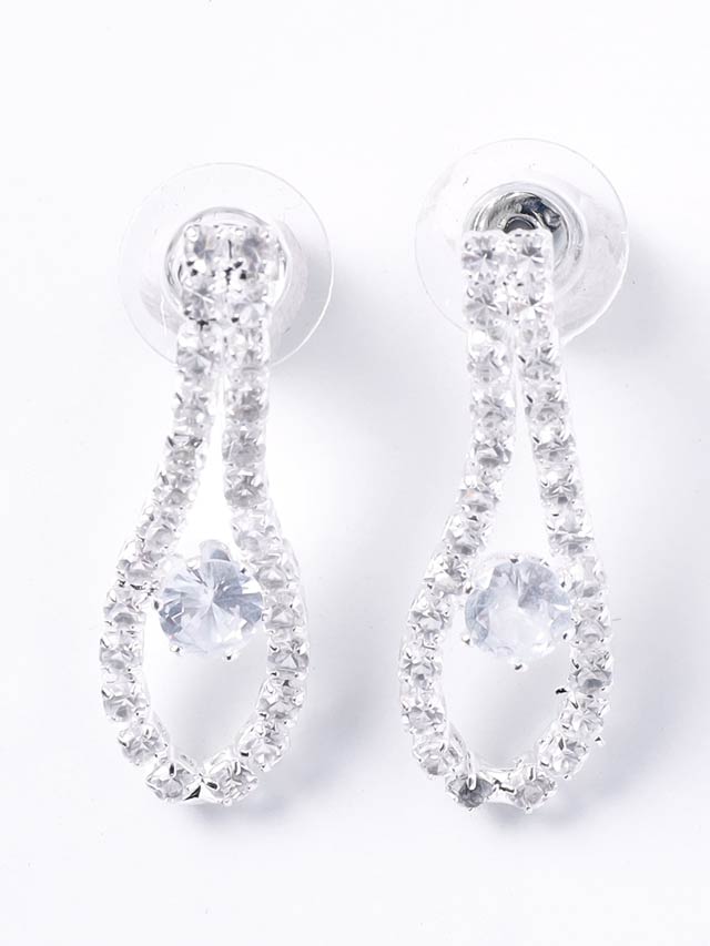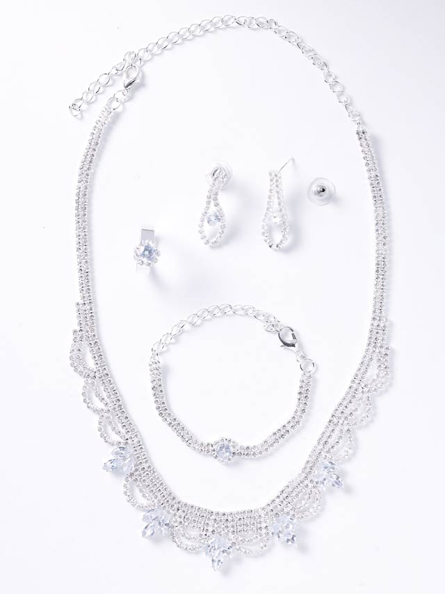 アーチ状のラインストーンから連なるドロップビジューがゴージャス感溢れるネックレス&ピアスセット。一粒ストーンの輝きが美しいお揃いのリングとブレスレットも付いたお得な4点セット♪ 場面に応じて使い分け出来る万能アイテムです◎